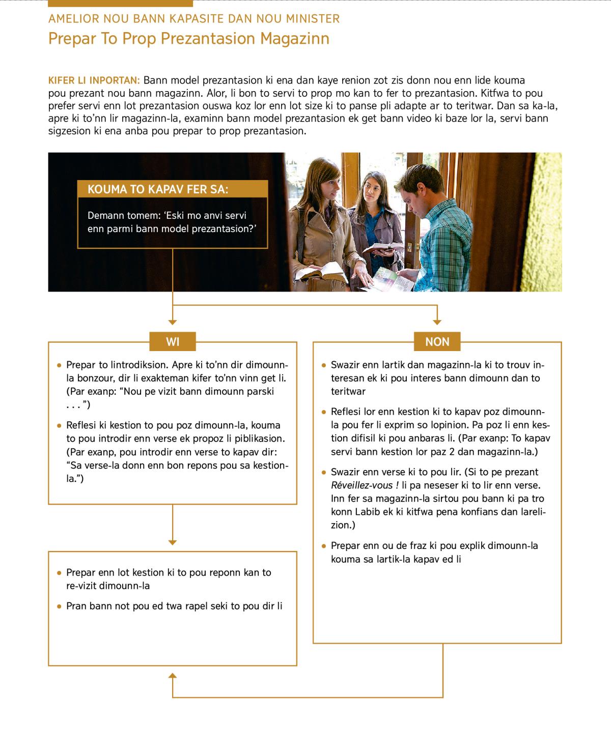 KIFER LI INPORTAN: Bann model prezantasion ki ena dan kaye renion zot zis donn nou enn lide kouma pou prezant nou bann magazinn. Alor, li bon to servi to prop mo kan to fer to prezantasion. Kitfwa to pou prefer servi enn lot prezantasion ouswa koz lor enn lot size ki to panse pli adapte ar to teritwar. Dan sa ka-la, apre ki to’nn lir magazinn-la, examinn bann model prezantasion ek get bann video ki baze lor la, servi bann sigzesion ki ena anba pou prepar to prop prezantasion.