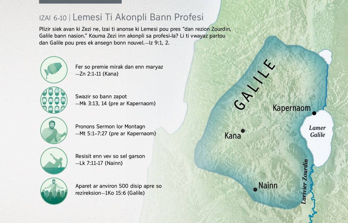 Plizir siek avan ki Zezi ne, Izai ti anonse ki Lemesi pou pres “dan rezion Zourdin, Galile bann nasion.” Kouma Zezi inn akonpli sa profesi-la? Li ti vwayaz partou dan Galile pou pres ek ansegn bonn nouvel.—Iz 9:1, 2.
