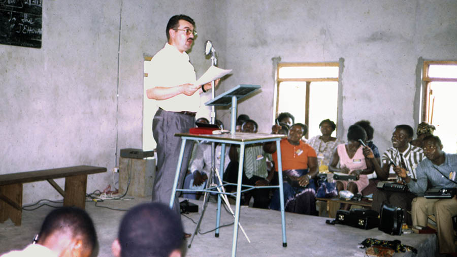 An 1973, mo madam ek mwa nou ti gagn linvitasion pou al servi dan Betel Lafrans. Mo premie afektasion laba ti bien difisil. Mo ti bizin avoy bann piblikasion pou nou bann frer dan Kamerounn. Nou laktivite laba ti interdi depi 1970 ziska 1993. Ankor enn fwa, mo ti pe demann momem: ‘Eski mo pou reisi fer sa?’ Frer ki ti responsab Betel Lafrans ti remarke ki sa kestion-la ti pe fatig mwa. Alor, li ti ankouraz mwa ek ti dir mwa: “Nou bann frer dan Kamerounn bien bizin zot nouritir spiritiel. Nou bizin pran zot swin!” Se seki nou ti fer.