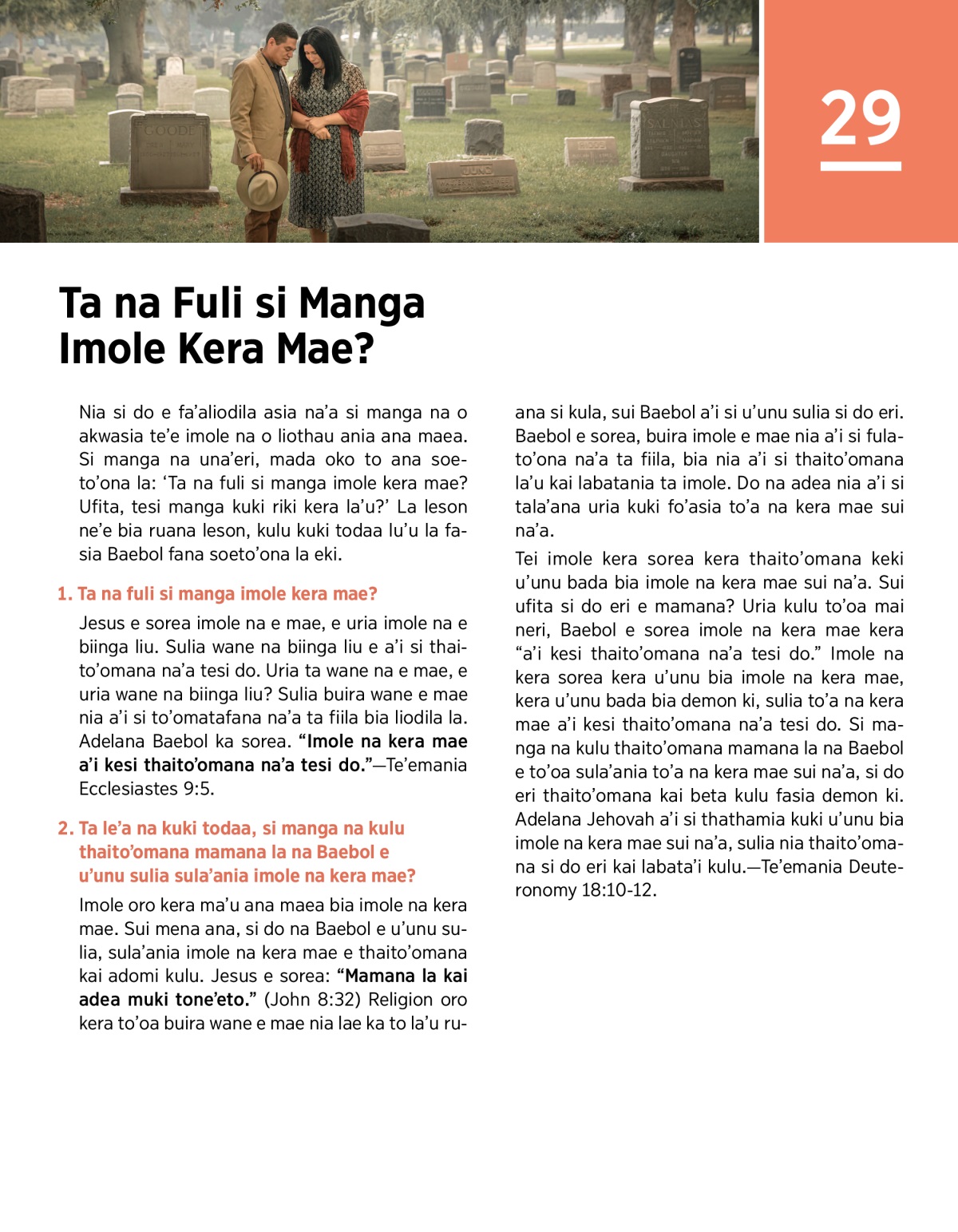 Jesus e sorea imole na e mae, e uria imole na e biinga liu. Sulia wane na biinga liu e a’i si thaito’omana na’a tesi do. Uria ta wane na e mae, e uria wane na biinga liu? Sulia buira wane e mae nia a’i si to’omatafana na’a ta fiila bia liodila la. Adelana Baebol ka sorea. “Imole na kera mae a’i kesi thaito’omana na’a tesi do.”​—Te’emania Ecclesiastes 9:5.