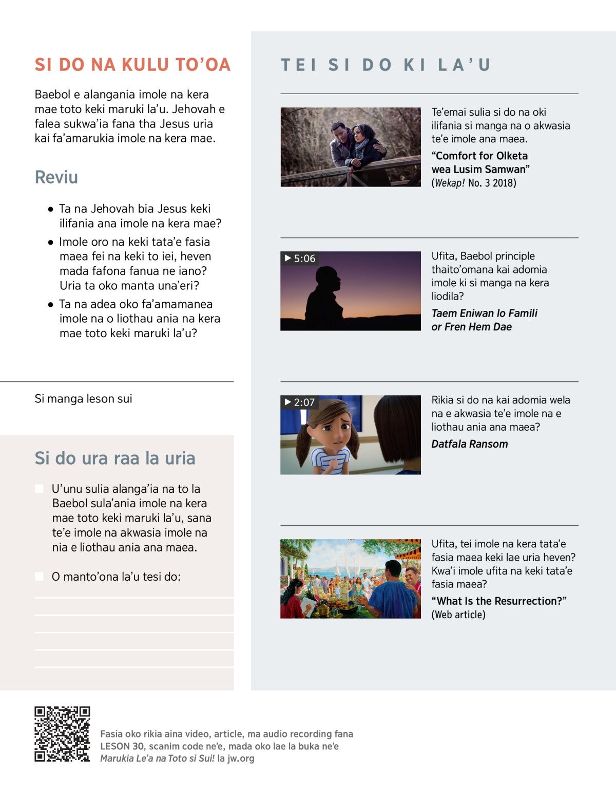 Maea e falea liodilaa fana imole ki, do na adea Baebol ka sorea maea nia te’e ma’alimae. (1 Corinthians 15:26) Uria na kulu to’oa la leson 27, Jehovah kai fa’asuia maea. Sui imole na kera mae sui na’a keki ufita? La leson ne’e, kuki to’oa Jehovah e alangania toto kai fa’amarukia imole na kera mae. Ufita, alanga’ia eri kai mamana? Ma imole na Jehovah kai fa’amaruki kera fei na keki to iei, heven mada fafona fanua ne iano?