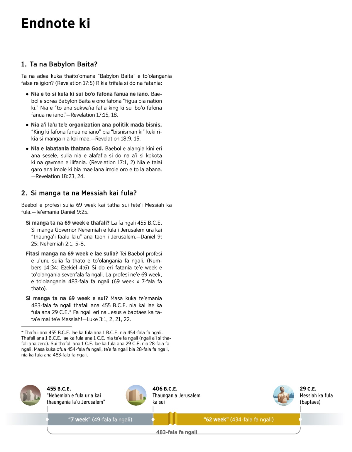 Si manga ta na 69 week e thafali? La fa ngali 455 B.C.E. Si manga Governor Nehemiah e fula i Jerusalem ura kai “thaunga’i faalu la’u” ana taon i Jerusalem.—Daniel 9:25; Nehemiah 2:1, 5-8.
