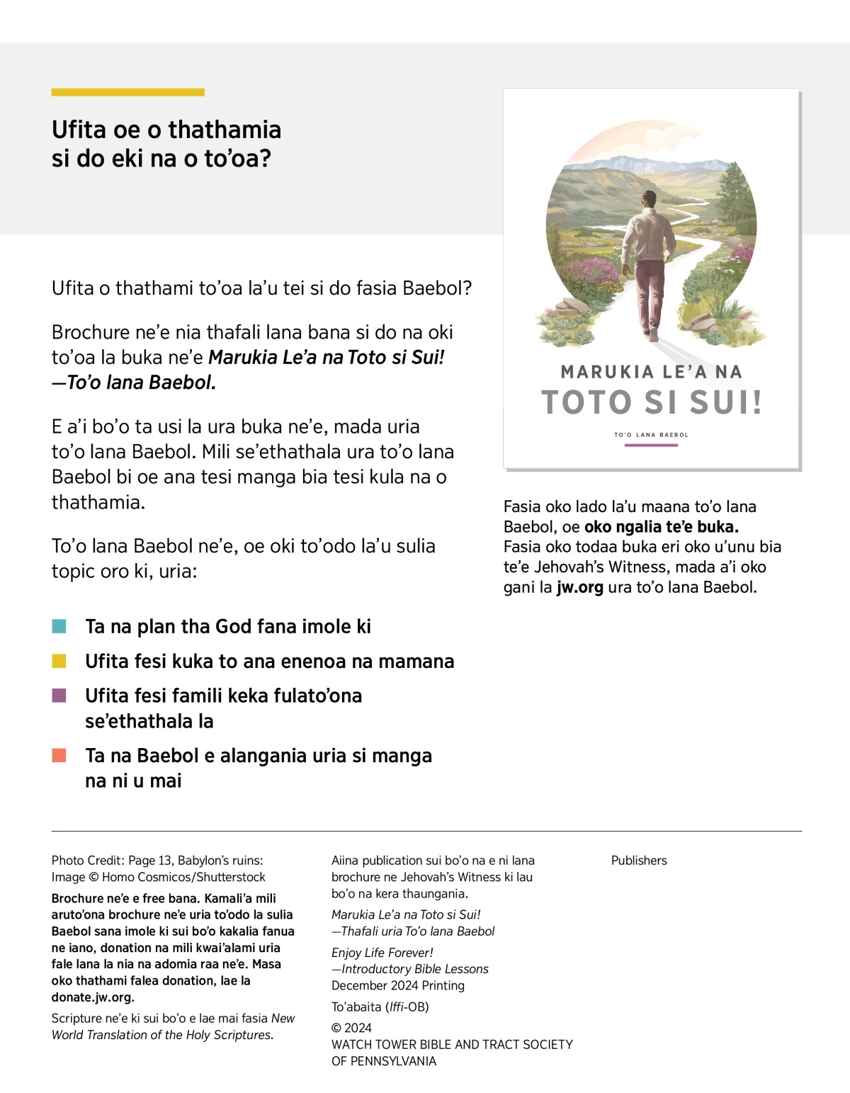 Fasia oko lado la’u maana to’o lana Baebol, oe oko ngalia te’e buka. Fasia oko todaa buka eri oko u’unu bia te’e Jehovah’s Witness, mada a’i oko gani la jw.org ura to’o lana Baebol.