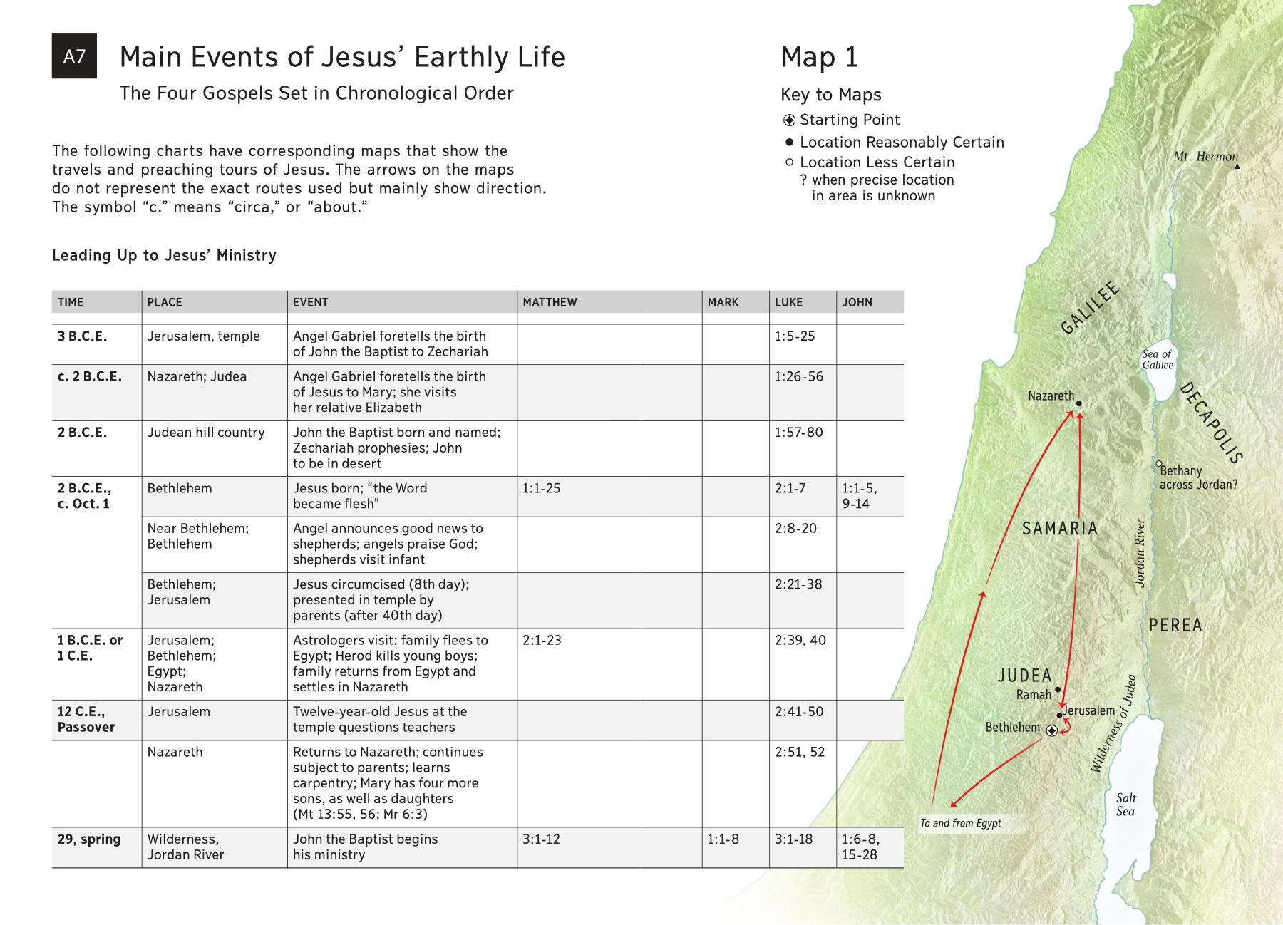 The following charts have corresponding maps that show the travels and preaching tours of Jesus. The arrows on the maps do not represent the exact routes used but mainly show direction. The symbol “c.” means “circa,” or “about.”