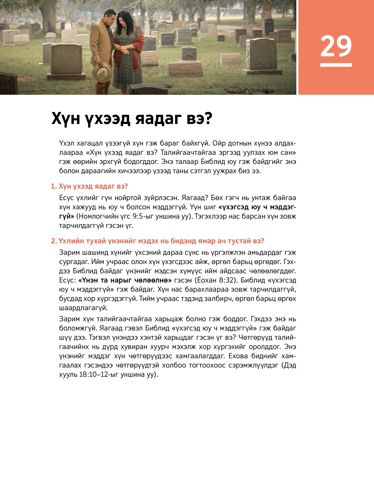 Үхэл хагацал үзээгүй хүн гэж бараг байхгүй. Ойр дотнын хүнээ алдахлаараа «Хүн үхээд яадаг вэ? Талийгаачтайгаа эргээд уулзах юм сан» гэж өөрийн эрхгүй бодогддог. Энэ талаар Библид юу гэж байдгийг энэ болон дараагийн хичээлээр үзээд таны сэтгэл уужрах биз ээ.