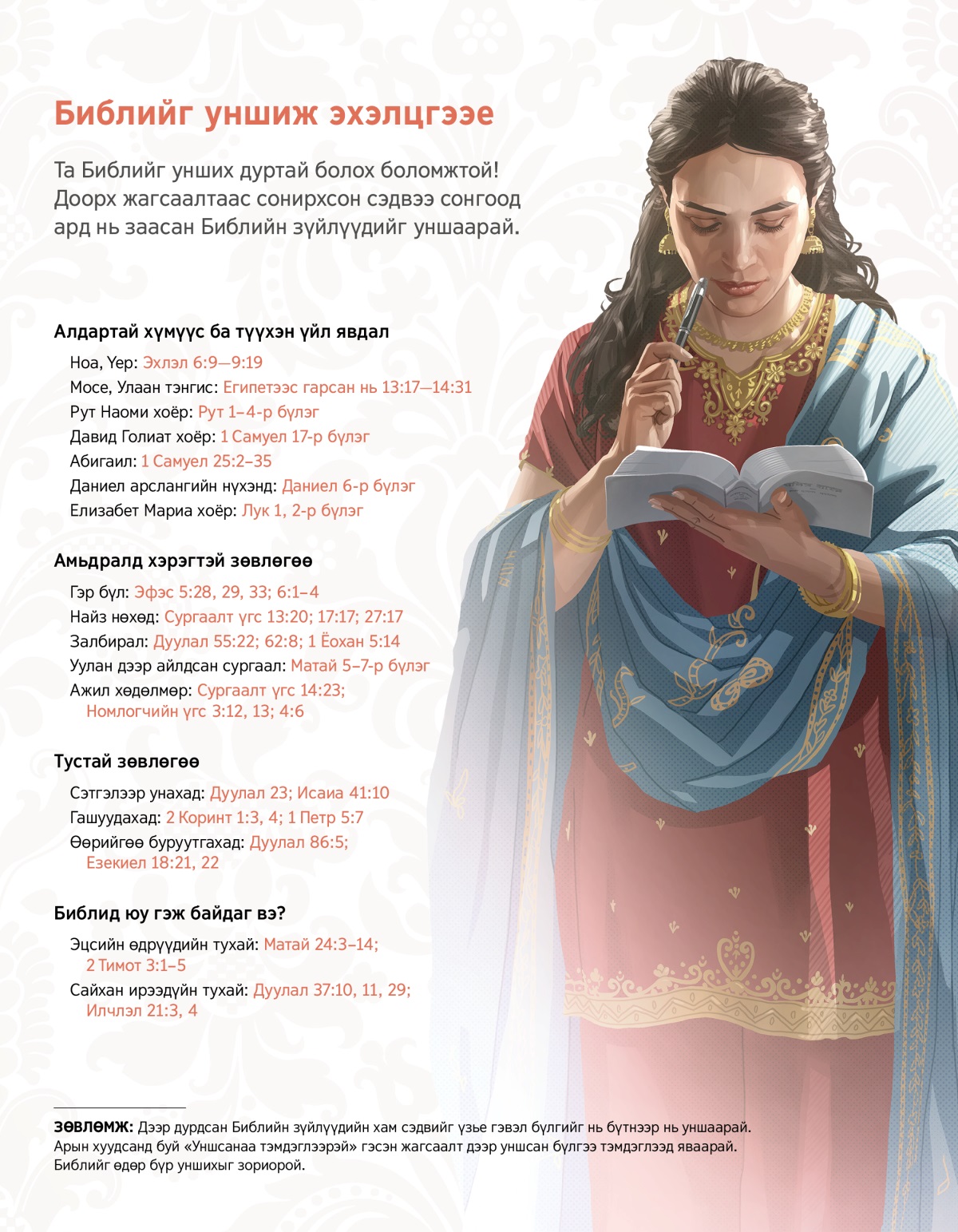 ЗӨВЛӨМЖ: Дээр дурдсан Библийн зүйлүүдийн хам сэдвийг үзье гэвэл бүлгийг нь бүтнээр нь уншаарай. Арын хуудсанд буй «Уншсанаа тэмдэглээрэй» гэсэн жагсаалт дээр уншсан бүлгээ тэмдэглээд яваарай. Библийг өдөр бүр уншихыг зориорой.