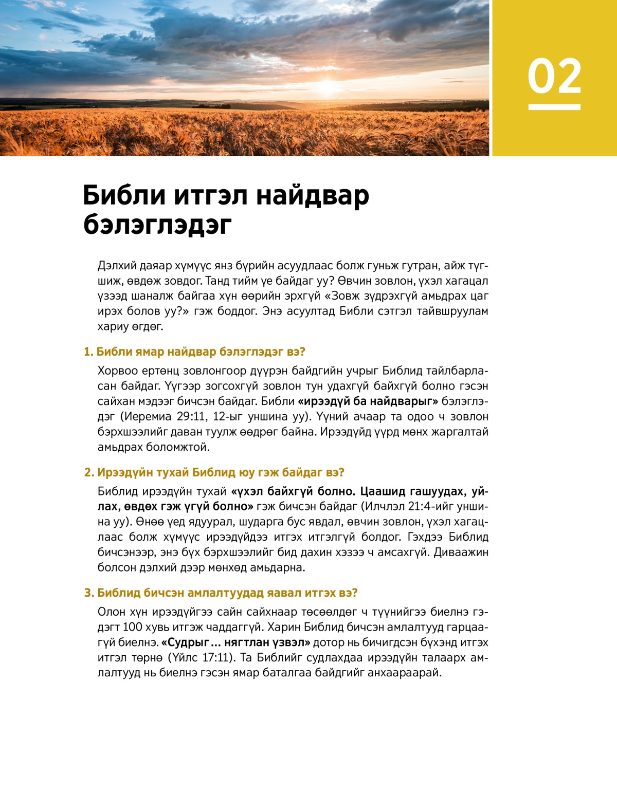 Библи найдвар бэлэглэдэг учраас бид одоо жаргалтай амьдарч, ирээдүйгээ гэрэл гэгээтэйгээр хардаг.