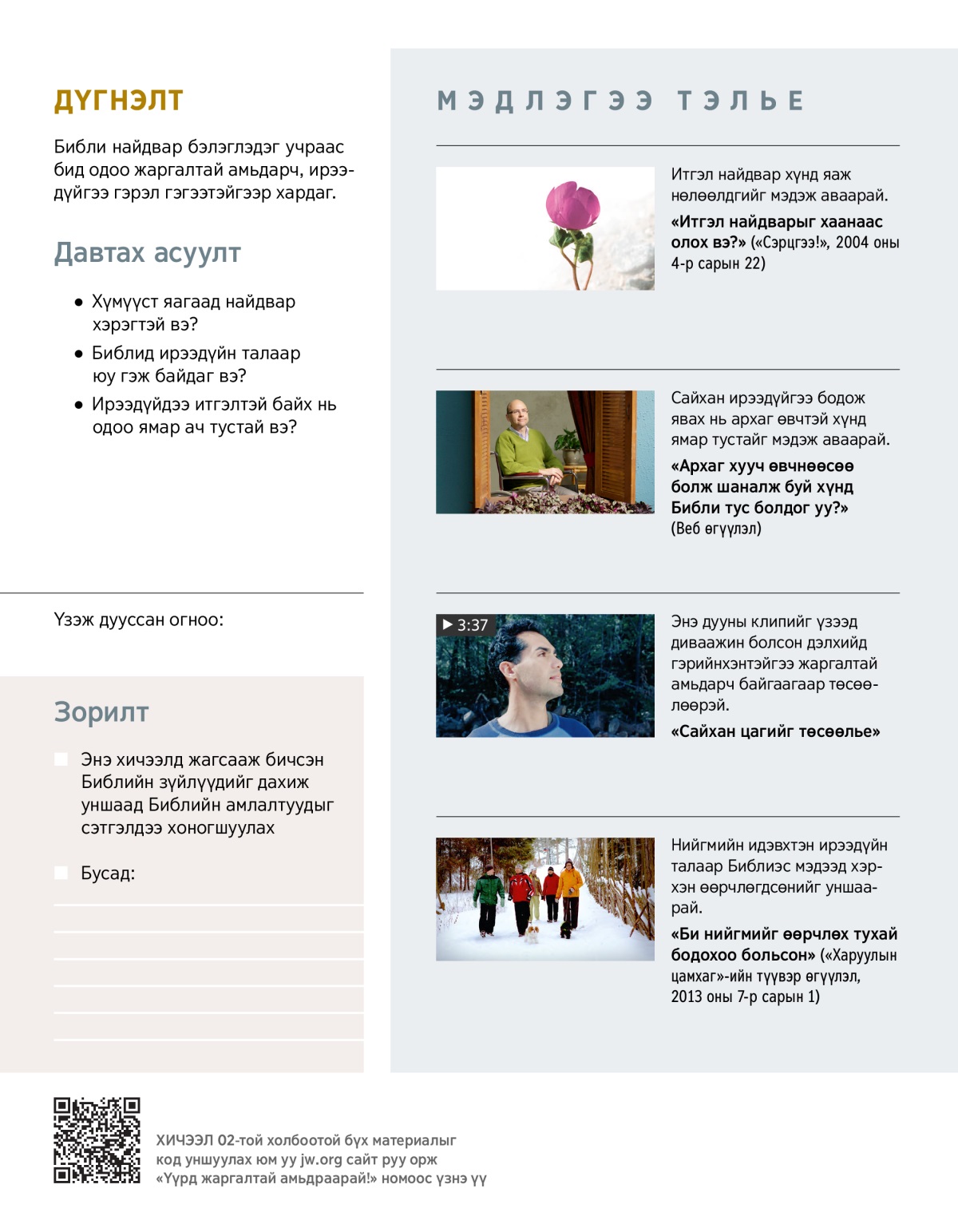 Библийн энэ зүйлүүд танд итгэл найдвар төрүүлж байна уу? Гэр бүл, найз нөхөд тань мэдвэл баярлах болов уу?