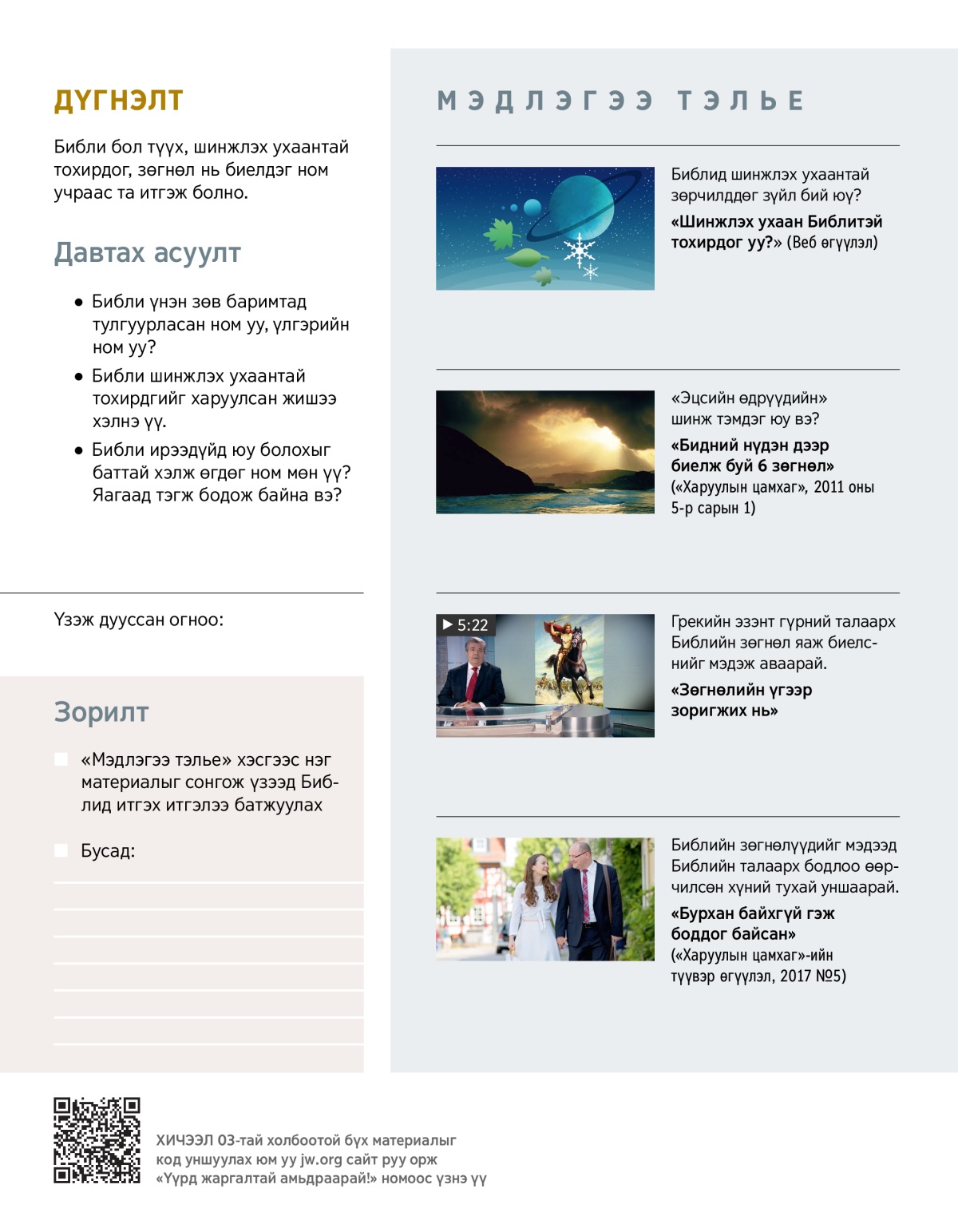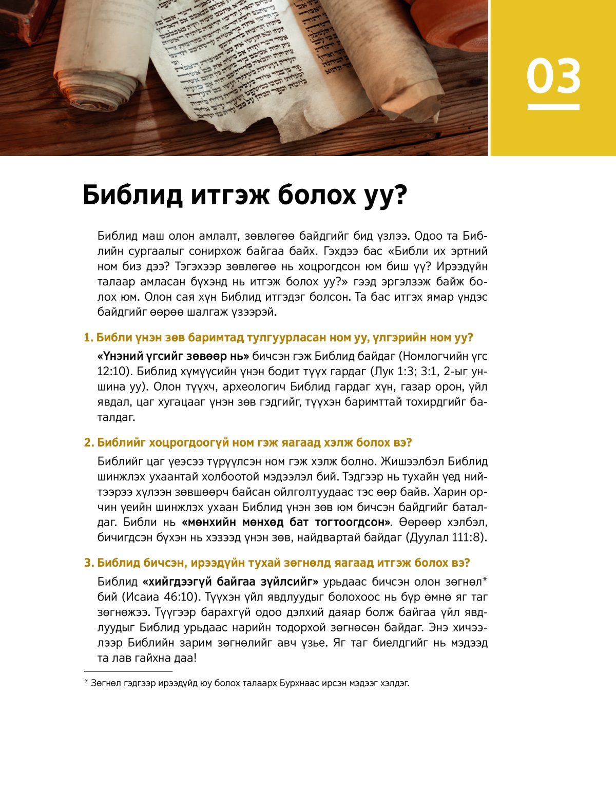 Библид маш олон амлалт, зөвлөгөө байдгийг бид үзлээ. Одоо та Библийн сургаалыг сонирхож байгаа байх. Гэхдээ бас «Библи их эртний ном биз дээ? Тэгэхээр зөвлөгөө нь хоцрогдсон юм биш үү? Ирээдүйн талаар амласан бүхэнд нь итгэж болох уу?» гээд эргэлзэж байж болох юм. Олон сая хүн Библид итгэдэг болсон. Та бас итгэх ямар үндэс байдгийг өөрөө шалгаж үзээрэй.