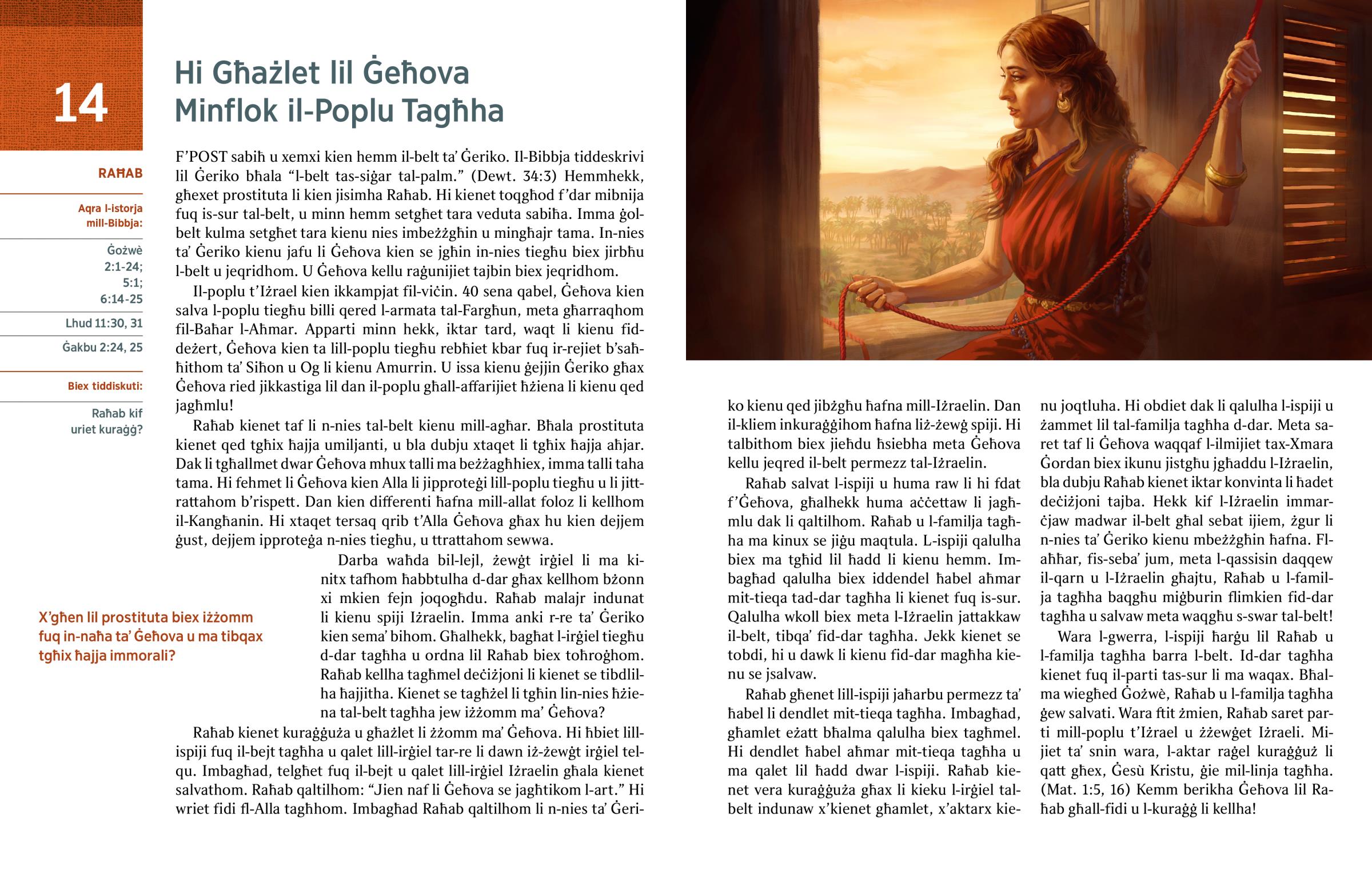 F’POST sabiħ u xemxi kien hemm il-belt taʼ Ġeriko. Il-Bibbja tiddeskrivi lil Ġeriko bħala “l-belt tas-siġar tal-palm.” (Dewt. 34:3) Hemmhekk, għexet prostituta li kien jisimha Raħab. Hi kienet toqgħod f’dar mibnija fuq is-sur tal-belt, u minn hemm setgħet tara veduta sabiħa. Imma ġol-belt kulma setgħet tara kienu nies imbeżżgħin u mingħajr tama. In-nies taʼ Ġeriko kienu jafu li Ġeħova kien se jgħin in-nies tiegħu biex jirbħu l-belt u jeqridhom. U Ġeħova kellu raġunijiet tajbin biex jeqridhom.