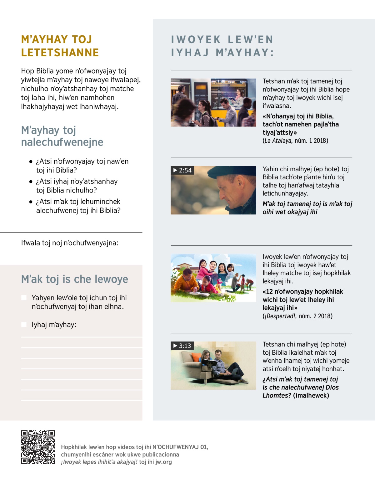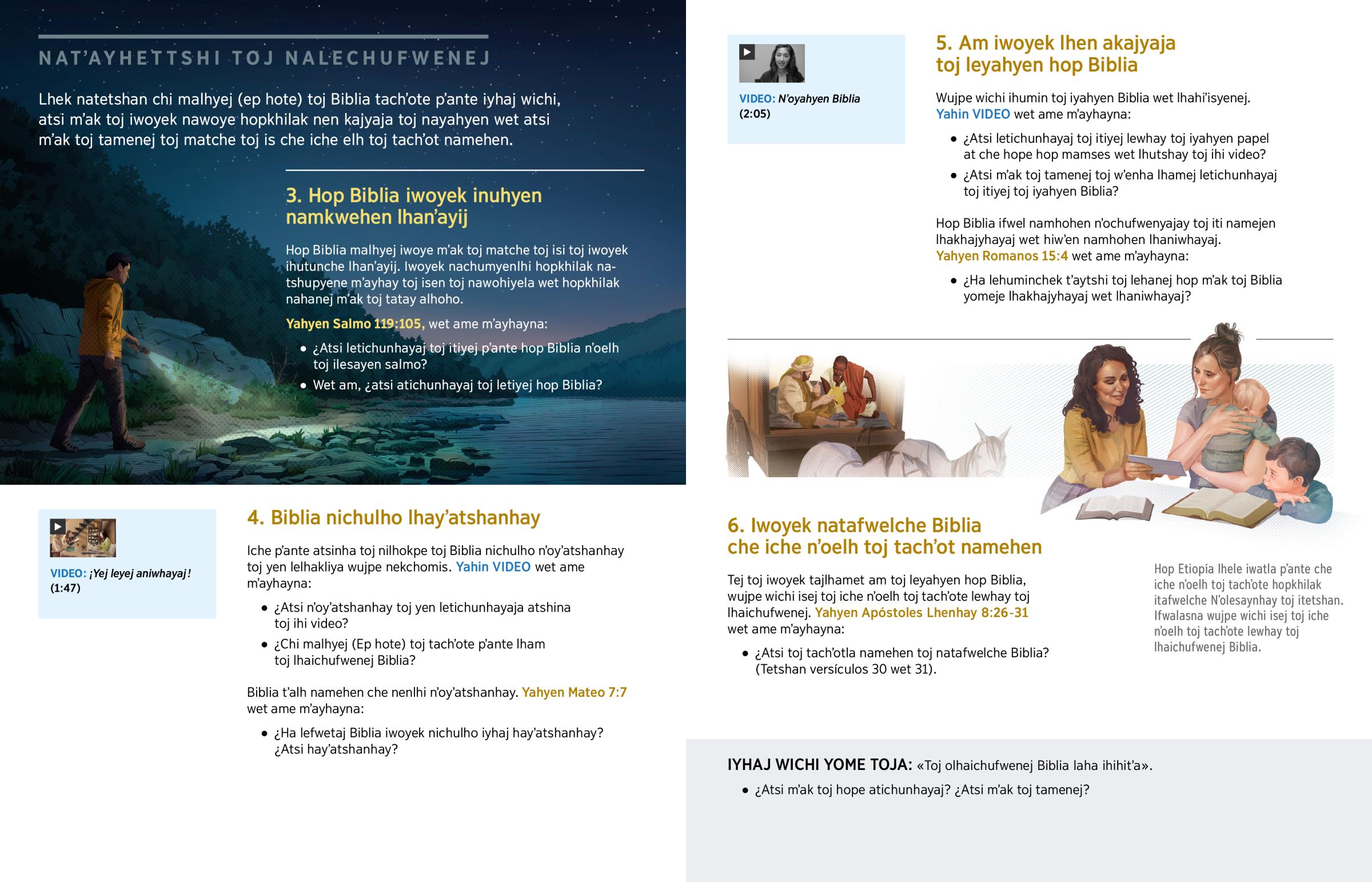 Hop Biblia hiwʼen namhohen nʼofwonyajay toj is. Ichufwenej wichi toj lewʼet lheley ihi hopkhilak matche toj lekajyaj ihi. Hate ichufwen namejen toj nen kajyaja lhachumet wet toj natatayhla toj nayʼenhen. Toj alechufwenejpej mʼayhay toj ihi papelna, lehanhiyeja mʼayhay toj ihi Biblia toj yiwtejla mʼayhay toj alechufwenej wet wujpe iyhaj mʼayhay. Toj malhyejtso kalelhajila tʼat amho toj «nilhokej Nʼolesaynhay tä ihi Lehi [...] tʼuhawetej» che lechumyenlhi (2 Timoteo 3:16).