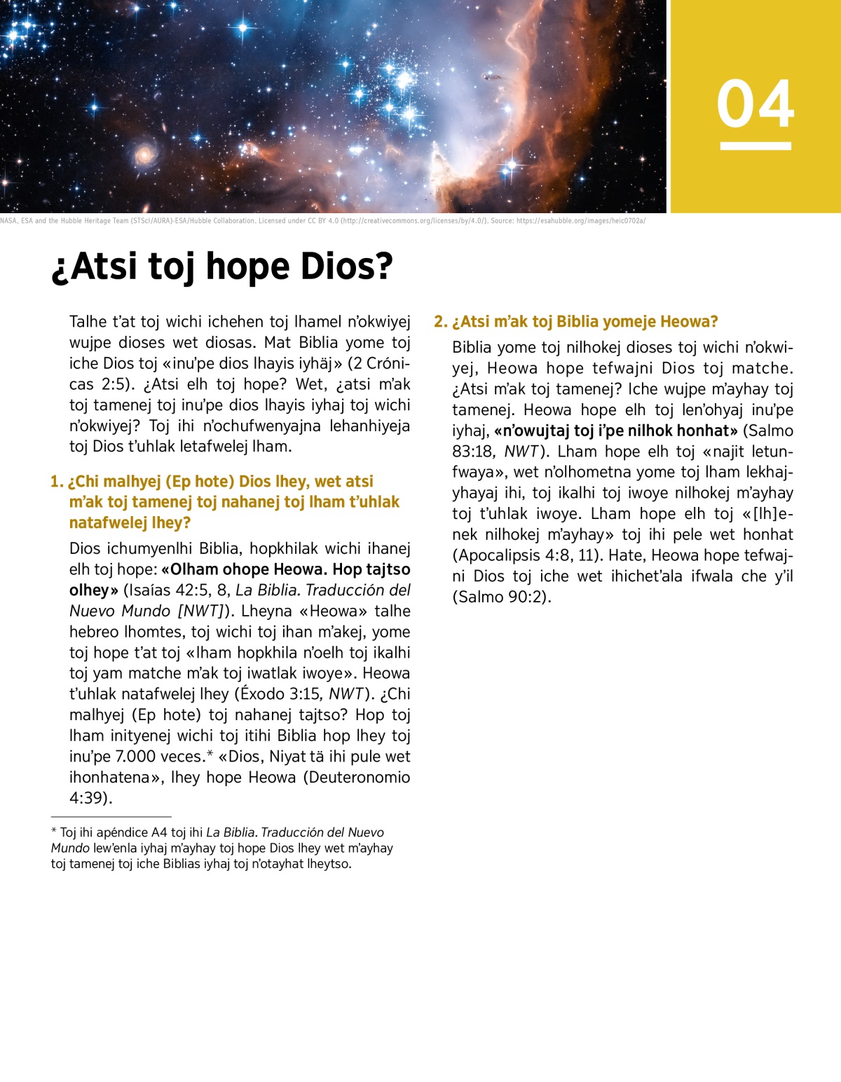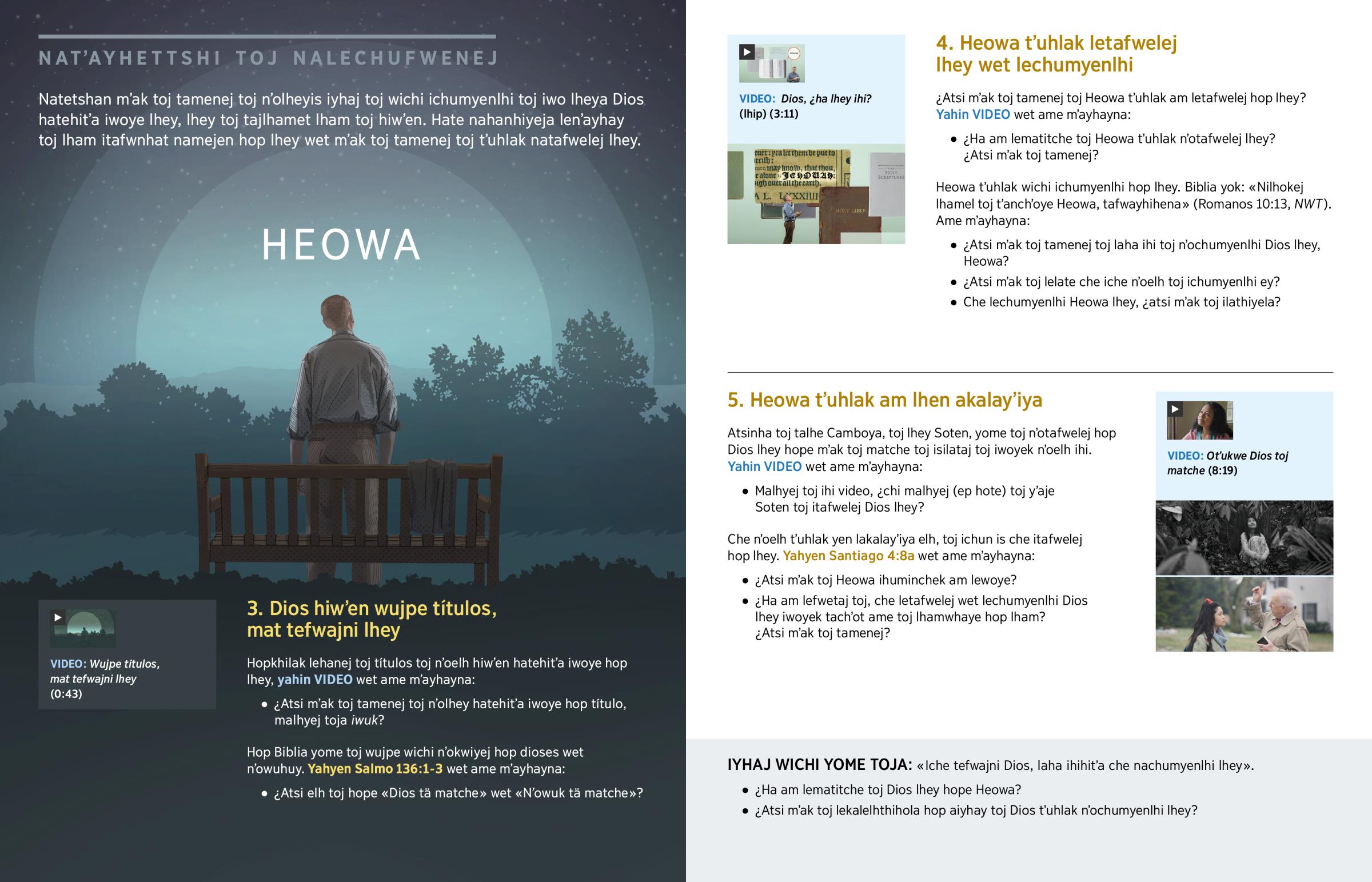 Dios ichumyenlhi Biblia, hopkhilak wichi ihanej elh toj hope: «Olham ohope Heowa. Hop tajtso olhey» (Isaías 42:5, 8, La Biblia. Traducción del Nuevo Mundo [NWT]). Lheyna «Heowa» talhe hebreo lhomtes, toj wichi toj ihan mʼakej, yome toj hope tʼat toj «lham hopkhila nʼoelh toj ikalhi toj yam matche mʼak toj iwatlak iwoye». Heowa tʼuhlak natafwelej lhey (Éxodo 3:15, NWT). ¿Chi malhyej (Ep hote) toj nahanej tajtso? Hop toj lham inityenej wichi toj itihi Biblia hop lhey toj inuʼpe 7.000 veces.a «Dios, Niyat tä ihi pule wet ihonhatena», lhey hope Heowa (Deuteronomio 4:39).