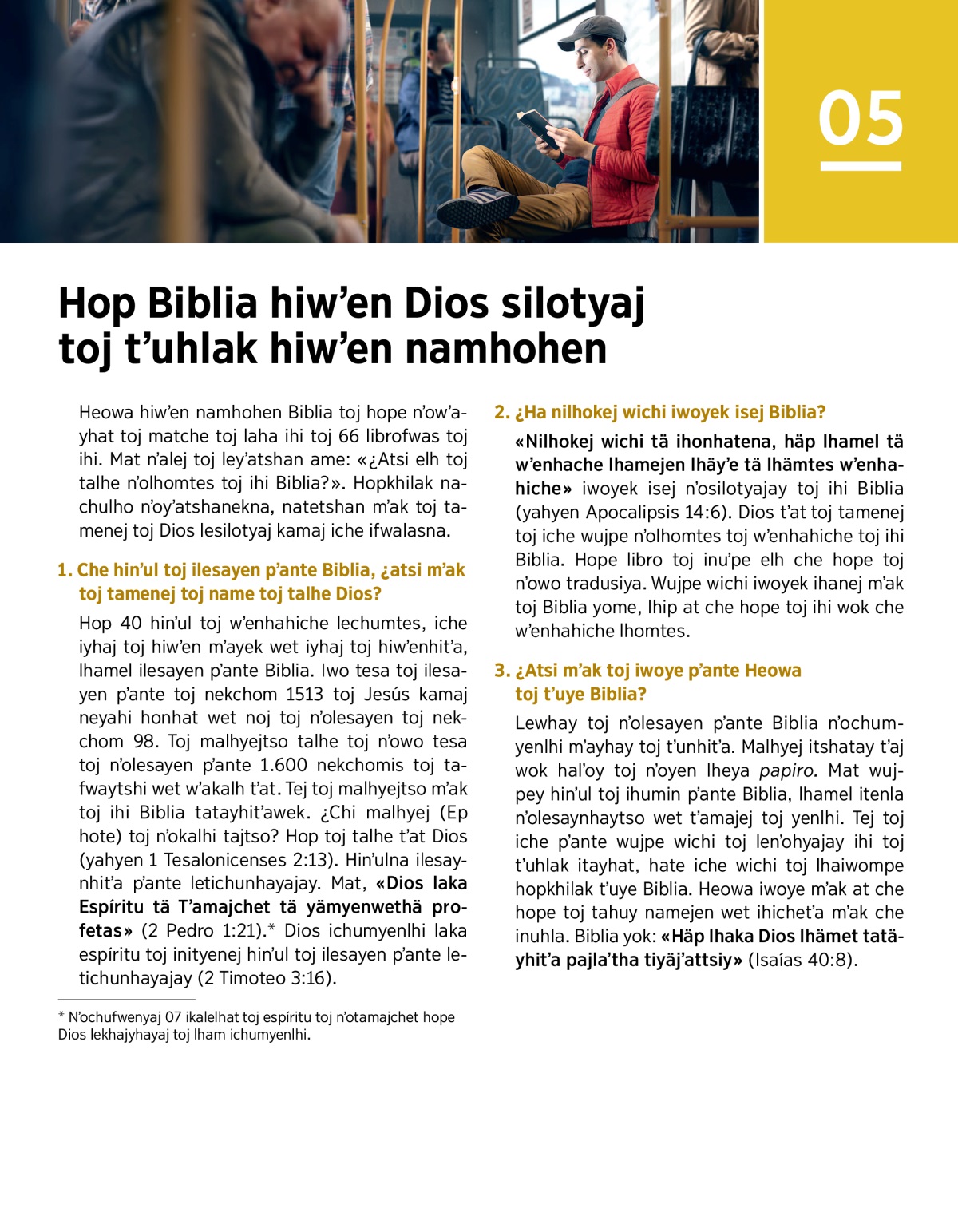 Heowa hiwʼen namhohen Biblia toj hope nʼowʼayhat toj matche toj laha ihi toj 66 librofwas toj ihi. Mat nʼalej toj leyʼatshan ame: «¿Atsi elh toj talhe nʼolhomtes toj ihi Biblia?». Hopkhilak nachulho nʼoyʼatshanekna, natetshan mʼak toj tamenej toj Dios lesilotyaj kamaj iche ifwalasna.