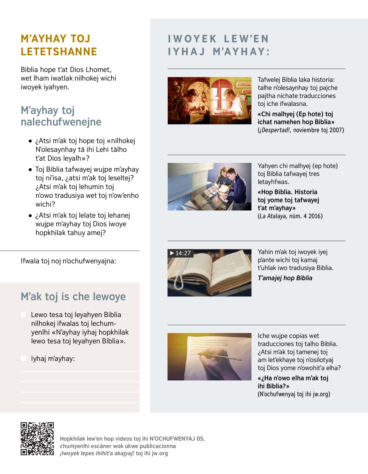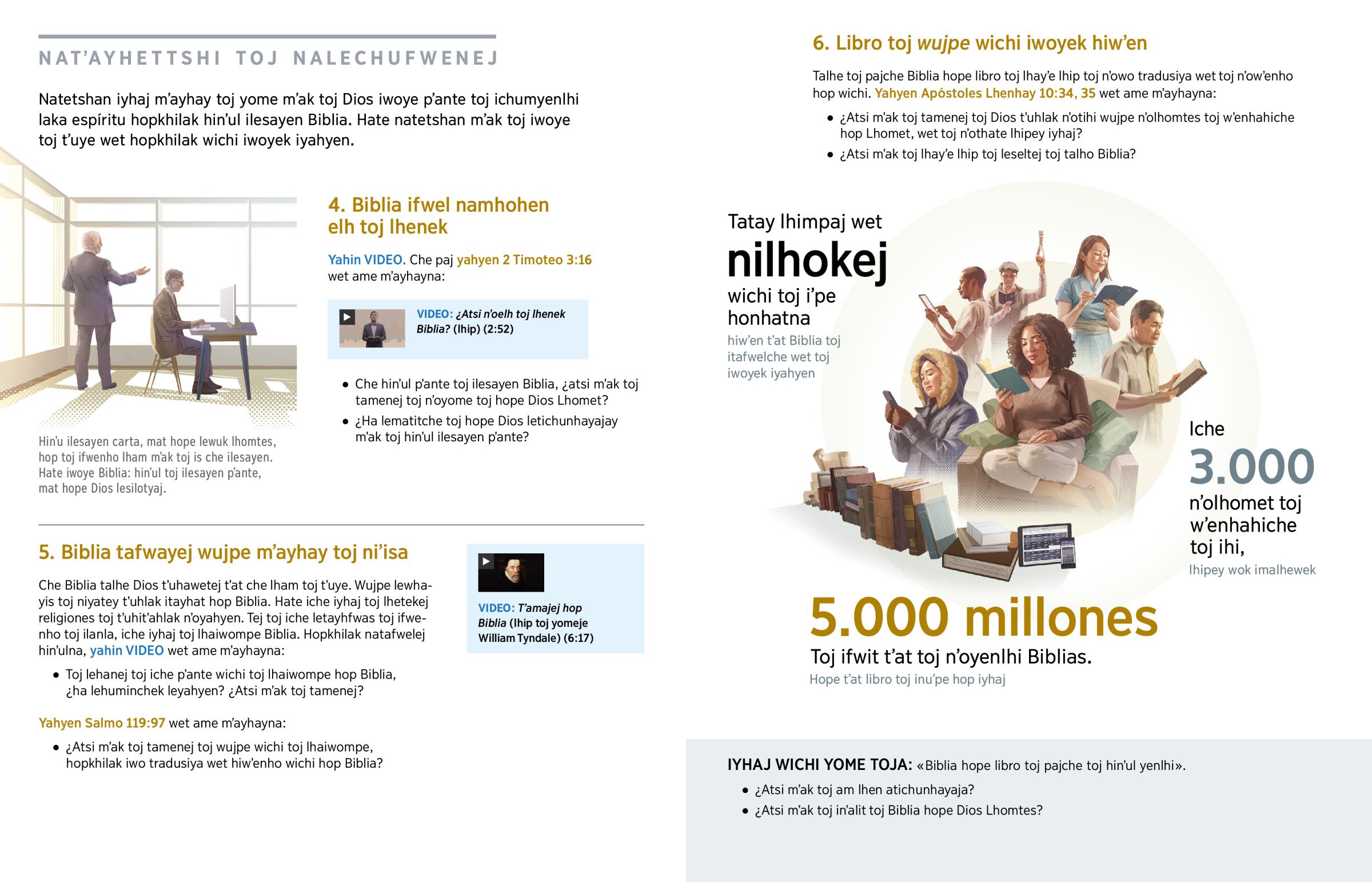 «Nilhokej wichi tä ihonhatena, häp lhamel tä wʼenhache lhamejen lhäyʼe tä lhämtes wʼenhahiche» iwoyek isej nʼosilotyajay toj ihi Biblia (yahyen Apocalipsis 14:6). Dios tʼat toj tamenej toj iche wujpe nʼolhomtes toj wʼenhahiche toj ihi Biblia. Hope libro toj inuʼpe elh che hope toj nʼowo tradusiya. Wujpe wichi iwoyek ihanej mʼak toj Biblia yome, lhip at che hope toj ihi wok che wʼenhahiche lhomtes.