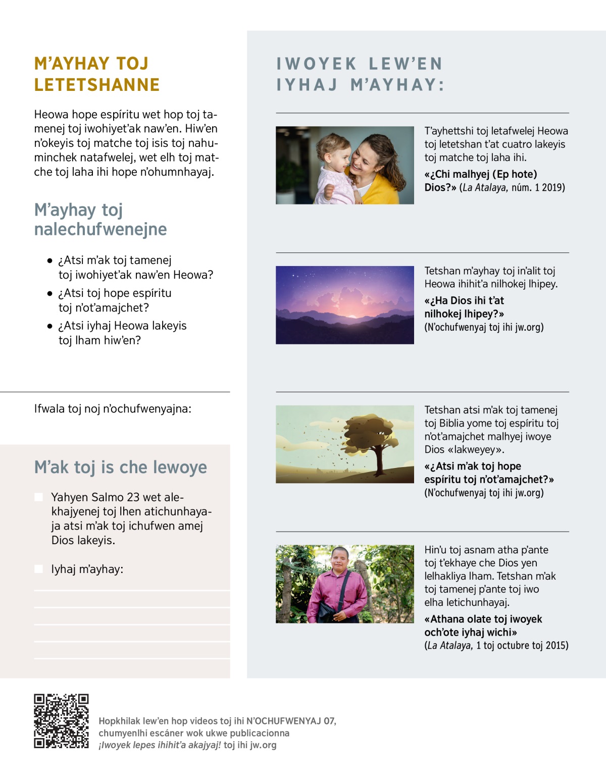 • Dios itshaylaʼpe laka espíritu toj nʼotʼamajchet hop wichi toj tʼalhchʼoye. Toj malhyejtso, ¿ha am lhen atichunhayaja toj espíritu toj nʼotʼamajchet hope nʼoelh, wok tajlhamet hope Dios lakhajyhayaj toj lham ichumyenlhi? ¿Atsi mʼak toj tamenej toj malhyejtso atichunhayaj?