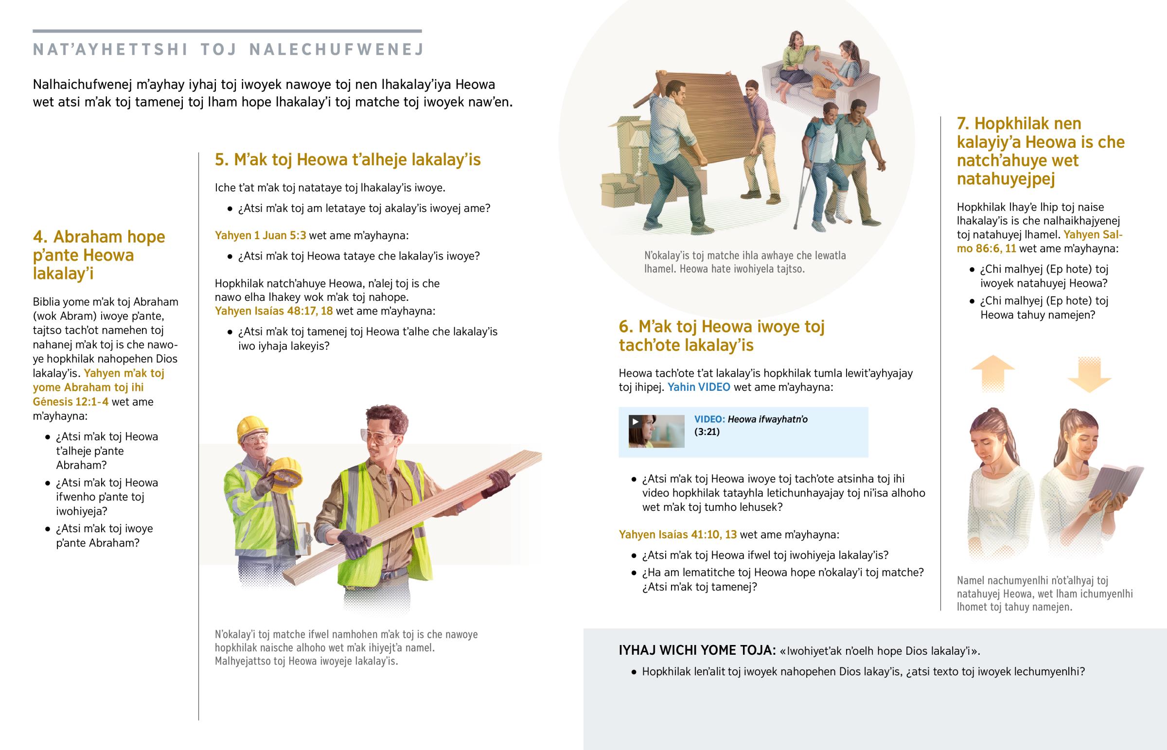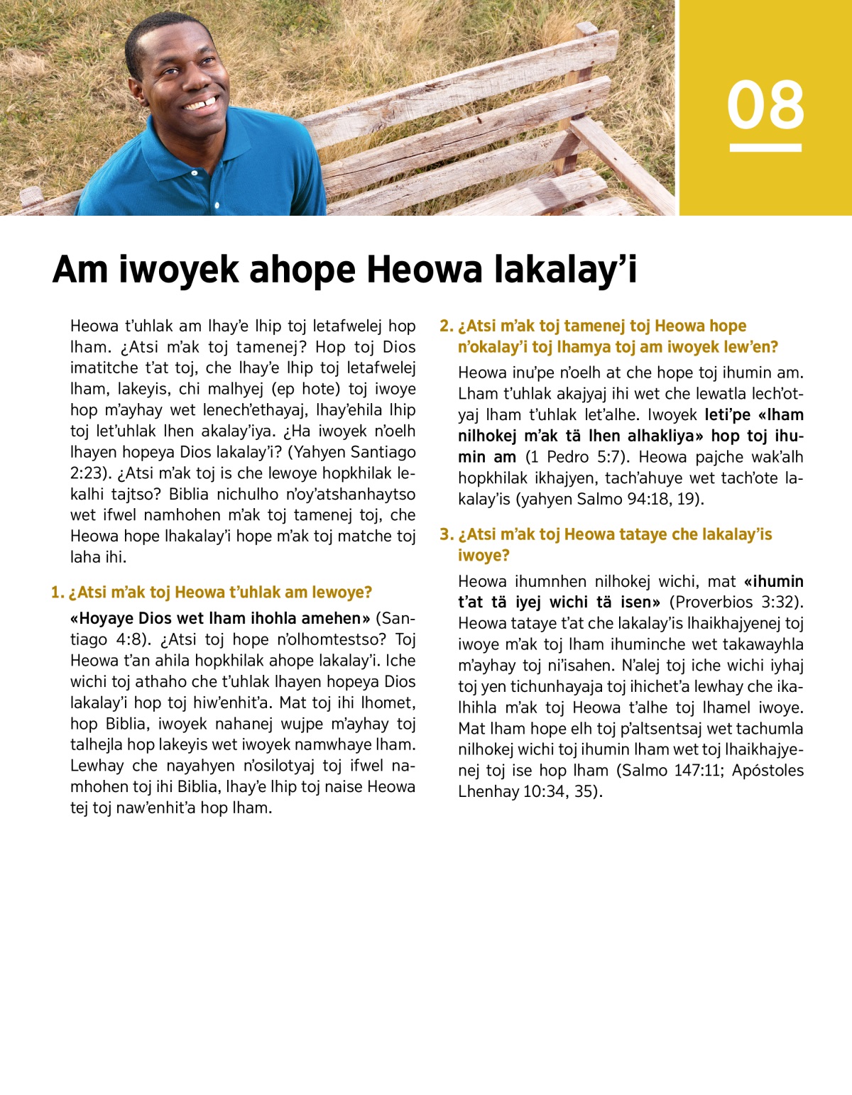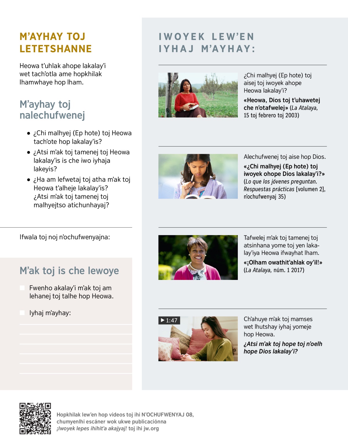 «Hoyaye Dios wet lham ihohla amehen» (Santiago 4:8). ¿Atsi toj hope nʼolhomtestso? Toj Heowa tʼan ahila hopkhilak ahope lakalayʼi. Iche wichi toj athaho che tʼuhlak lhayen hopeya Dios lakalayʼi hop toj hiwʼenhitʼa. Mat toj ihi lhomet, hop Biblia, iwoyek nahanej wujpe mʼayhay toj talhejla hop lakeyis wet iwoyek namwhaye lham. Lewhay che nayahyen nʼosilotyaj toj ifwel namhohen toj ihi Biblia, lhayʼe lhip toj naise Heowa tej toj nawʼenhitʼa hop lham.