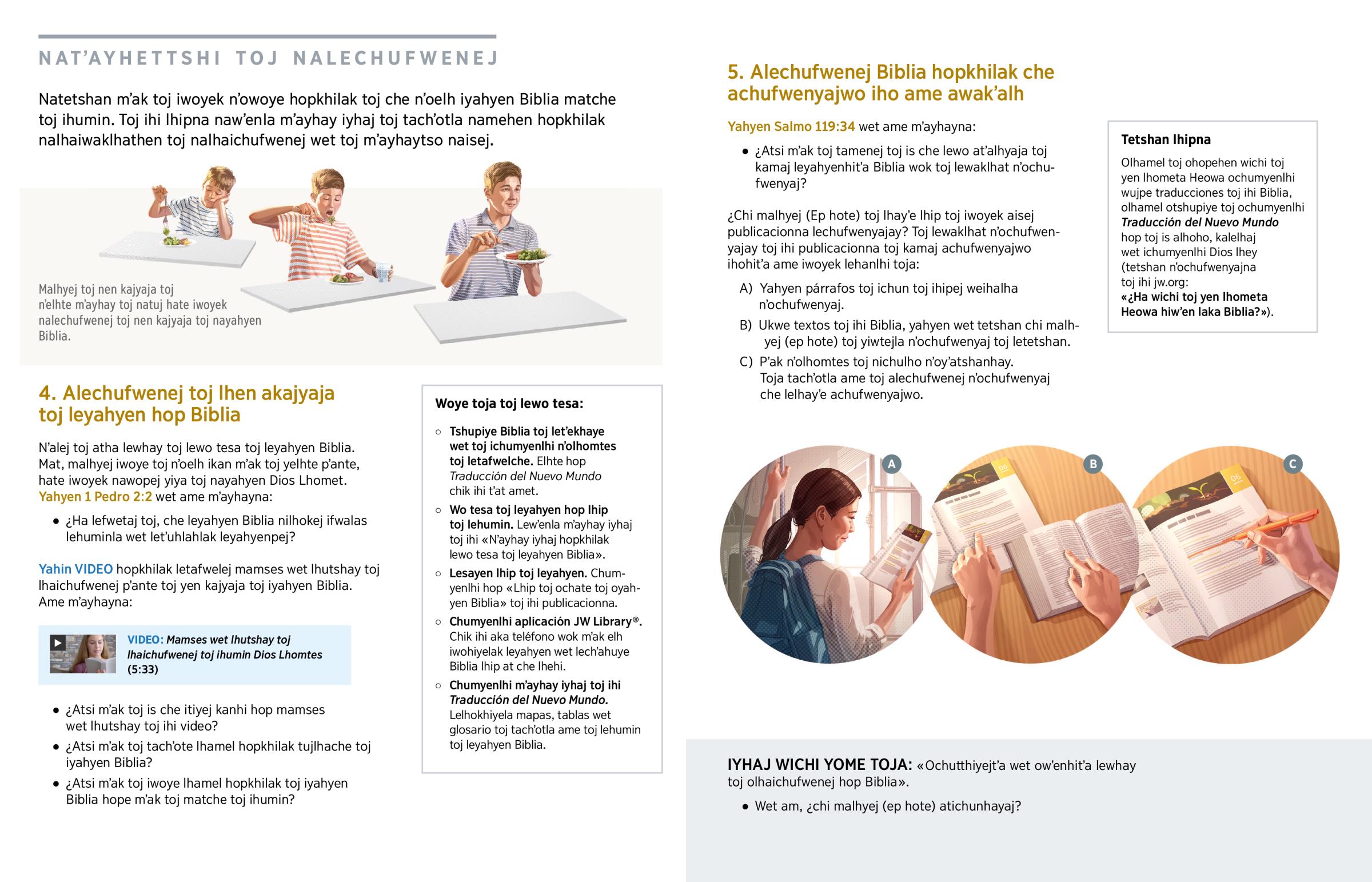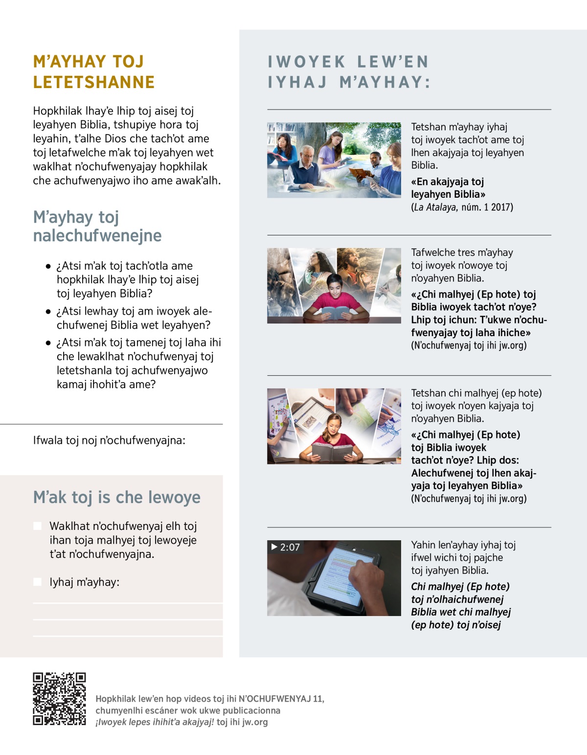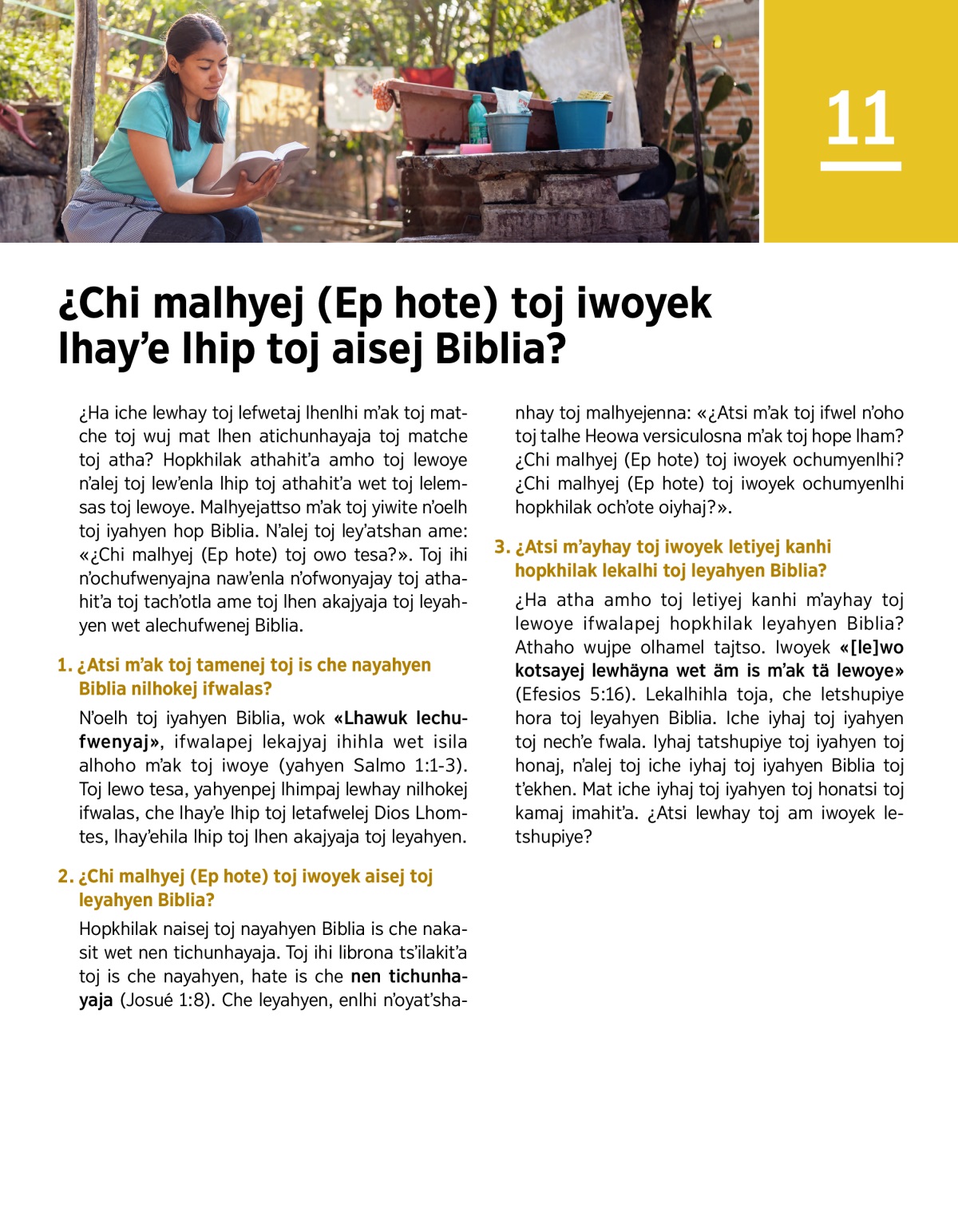 Hopkhilak naisej toj nayahyen Biblia is che nakasit wet nen tichunhayaja. Toj ihi librona tsʼilakitʼa toj is che nayahyen, hate is che nen tichunhayaja (Josué 1:8). Che leyahyen, enlhi nʼoyatʼshanhay toj malhyejenna: «¿Atsi mʼak toj ifwel nʼoho toj talhe Heowa versiculosna mʼak toj hope lham? ¿Chi malhyej (Ep hote) toj iwoyek ochumyenlhi? ¿Chi malhyej (Ep hote) toj iwoyek ochumyenlhi hopkhilak ochʼote oiyhaj?».