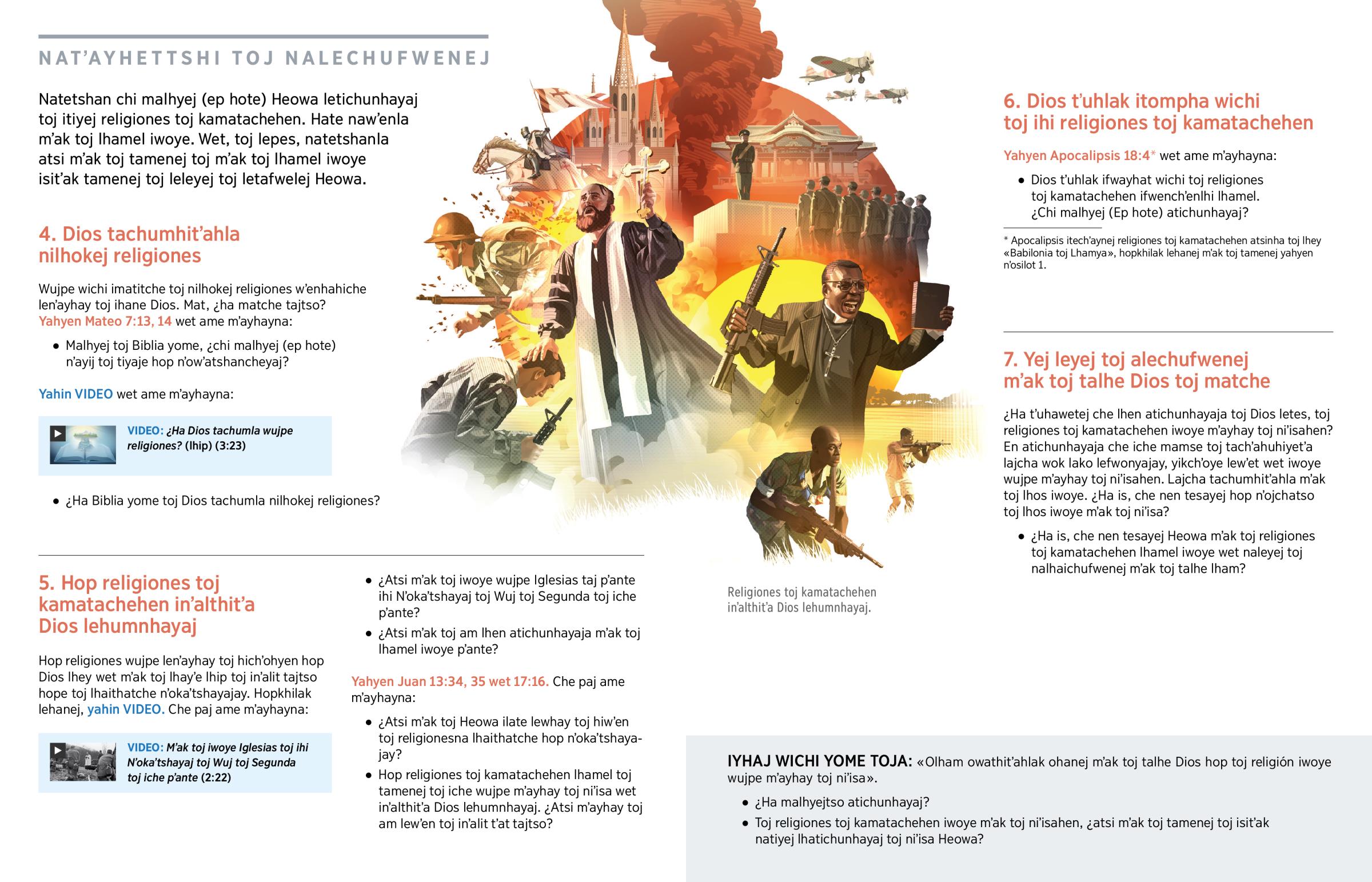 Religiones toj kamatachehen iwohiyetʼa mʼak toj is, lhamel hatehitʼa iwoye Heowa toj iwoyeje mʼak toj is wichi. Biblia yome toj «iskon lesukyajay yäk nichät puleye» (Apocalipsis 18:5). Siglos toj religiones toj kamatachehen lhayʼuytho políticos, lhaithatche nʼokaʼtshayajay, iwoye wet inuhitʼahla toj nʼolanhen wujpe wichi. Iche iyhaj toj lhetekej religionestso mʼak toj isis ilunej lhamel wet inityenej laka wichi hopkhilak tujlhache toj hiwʼen mʼayhayna. Mʼayhaytso toj lhamel iwoye inʼalit toj itafwnhiyejtʼa Dios. Hop toj tamenej toj iwohiyetʼak hope iyhaj toj Dios lakawos (yahyen 1 Juan 4:8).