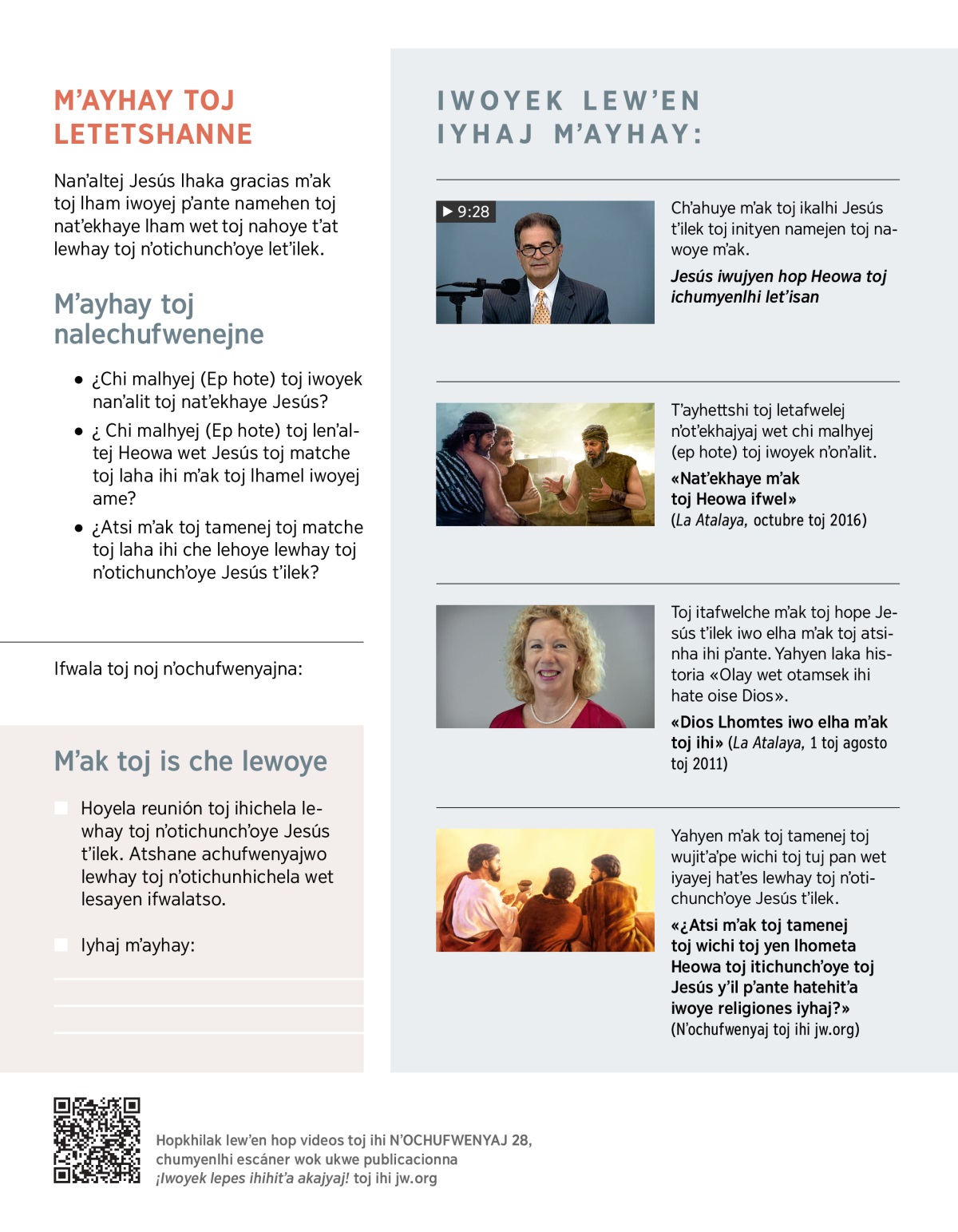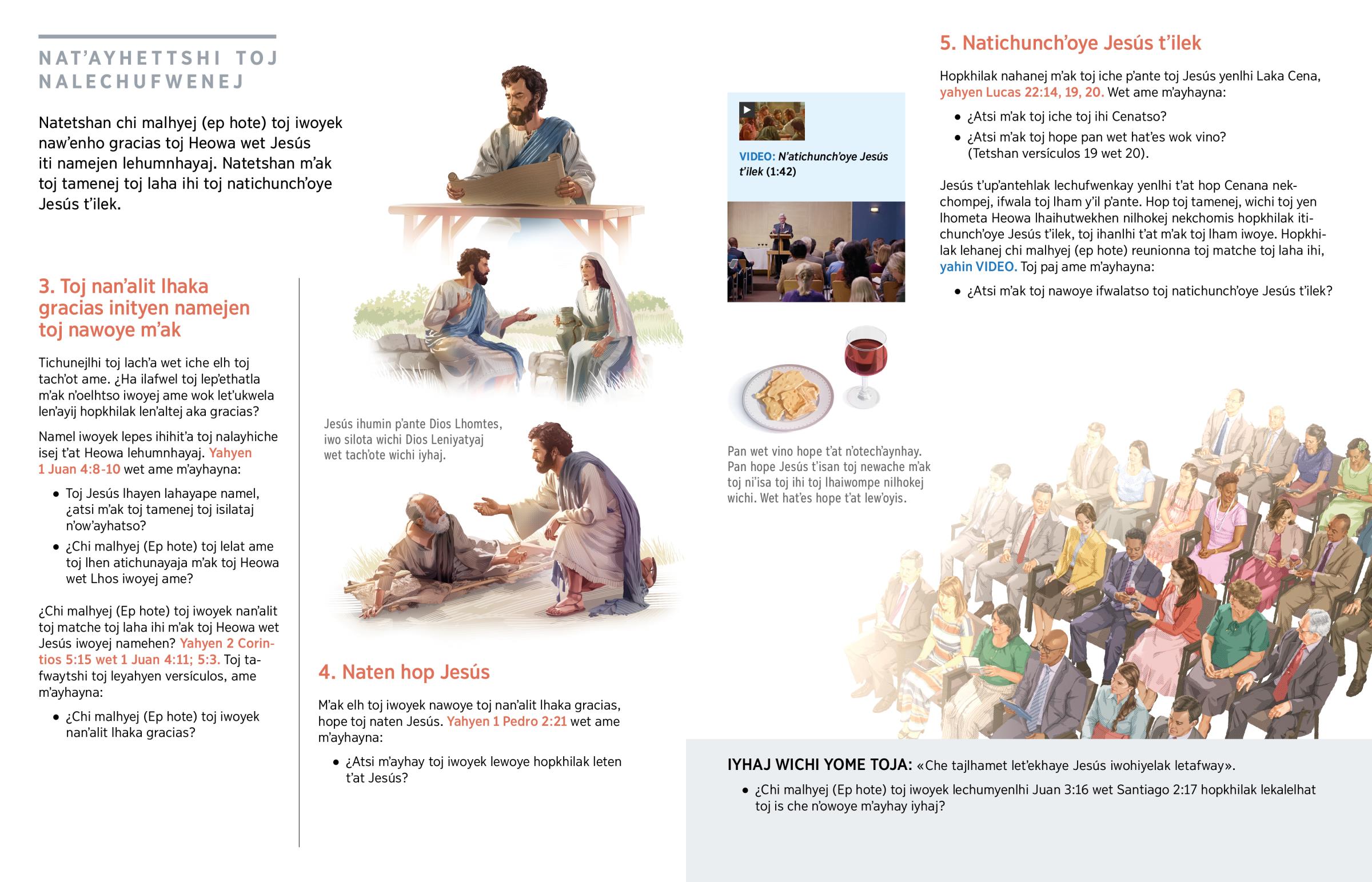 Jesús tʼupʼantehlak lechufwenkay yenlhi tʼat hop Cenana nekchompej, ifwala toj lham yʼil pʼante. Hop toj tamenej, wichi toj yen lhometa Heowa lhaihutwekhen nilhokej nekchomis hopkhilak itichunchʼoye Jesús tʼilek, toj ihanlhi tʼat mʼak toj lham iwoye. Hopkhilak lehanej chi malhyej (ep hote) reunionna toj matche toj laha ihi, yahin VIDEO. Toj paj ame mʼayhayna: