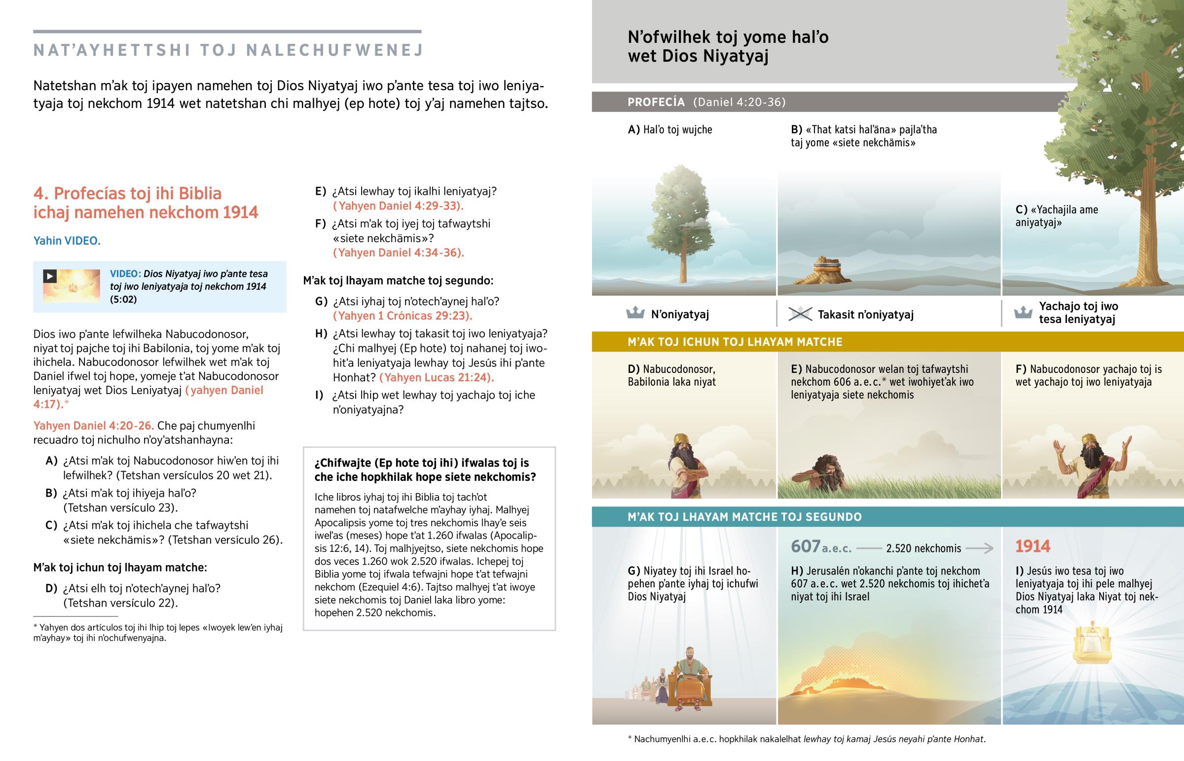 Libro toj lhey Daniel pajche yome pʼante toj Dios Niyatyaj iwohla tesa pʼante toj iwo leniyatyaja toj tafwaytshi lewhay toj nʼoyok «siete nekchämis» (Daniel 4:16, 17). Tafwaytshi siglos, Jesús yome lewhayistso toj yok «häp wichi tä kahäpeya Judíos lhayis tʼäsichela Jerusalén, yäk taj lepes», wet yome toj lewhayistso kamaj tajitʼa lepes (Lucas 21:24). Malhyej toj natetshanla, siete nekchomistso taj lepes nekchom 1914.