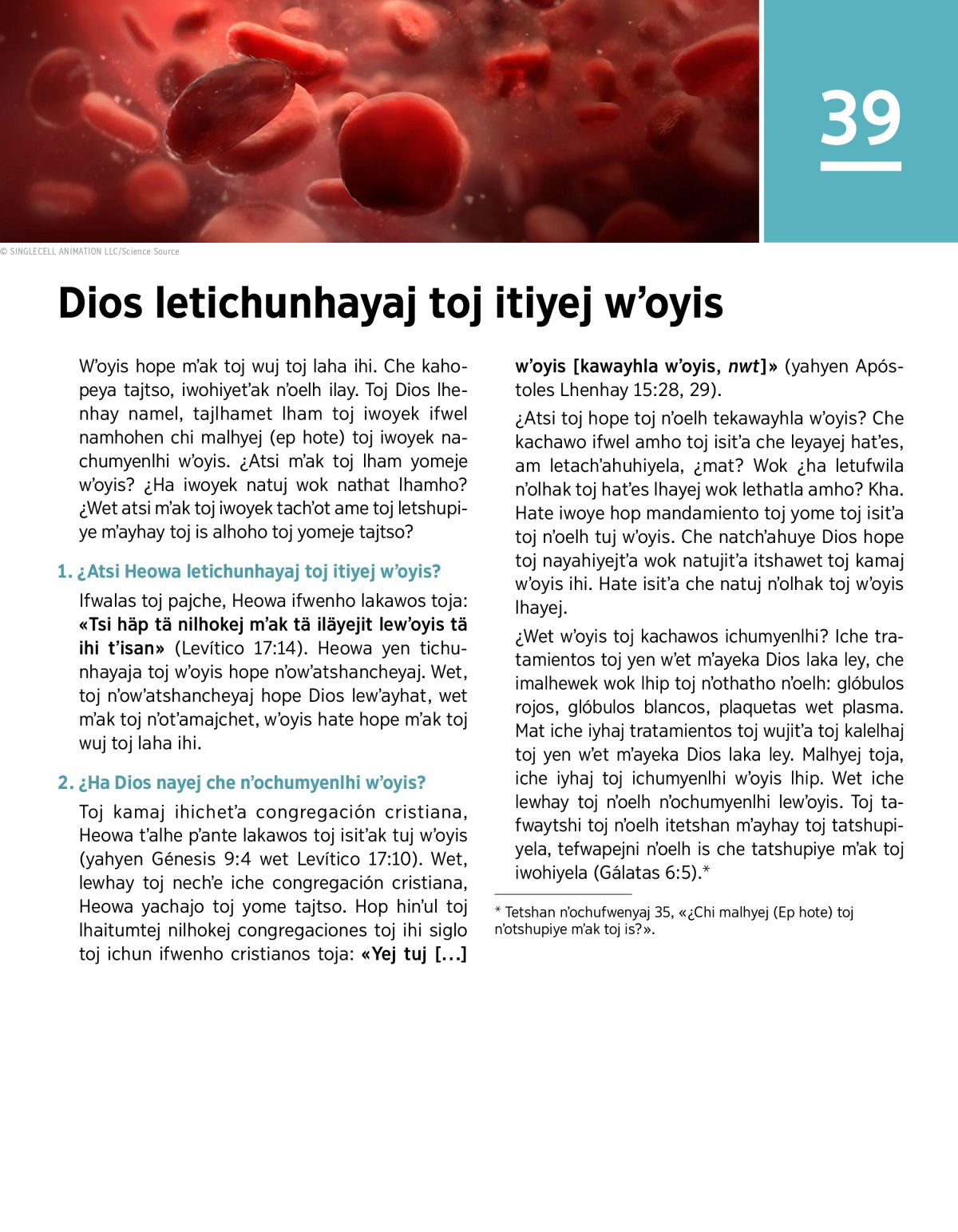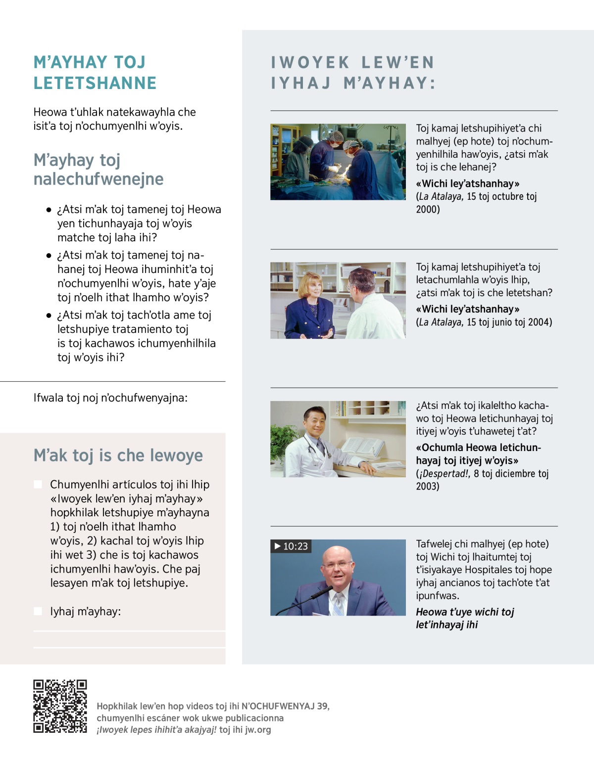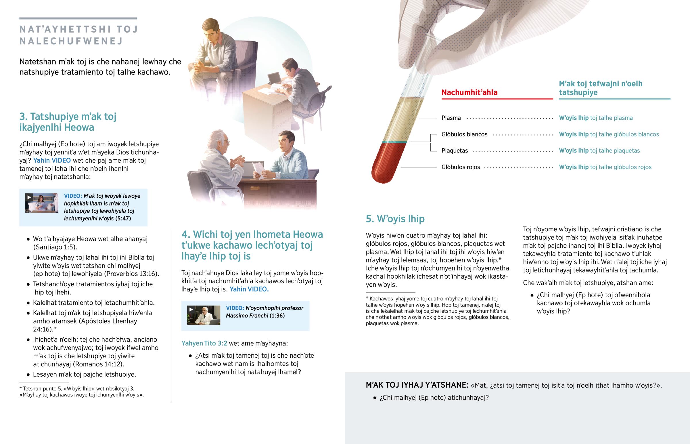 ¿Wet wʼoyis toj kachawos ichumyenlhi? Iche tratamientos toj yen wʼet mʼayeka Dios laka ley, che imalhewek wok lhip toj nʼothatho nʼoelh: glóbulos rojos, glóbulos blancos, plaquetas wet plasma. Mat iche iyhaj tratamientos toj wujitʼa toj kalelhaj toj yen wʼet mʼayeka Dios laka ley. Malhyej toja, iche iyhaj toj ichumyenlhi wʼoyis lhip. Wet iche lewhay toj nʼoelh nʼochumyenlhi lewʼoyis. Toj tafwaytshi toj nʼoelh itetshan mʼayhay toj tatshupiyela, tefwapejni nʼoelh is che tatshupiye mʼak toj iwohiyela (Gálatas 6:5).a