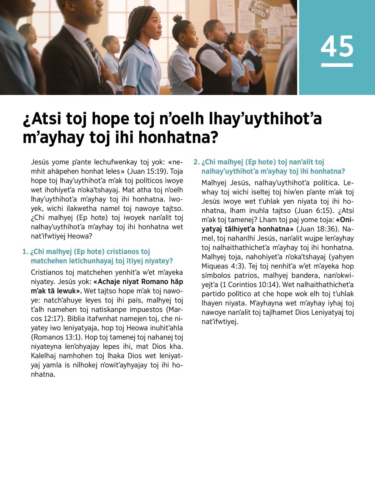 Malhyej Jesús, nalhayʼuythihotʼa política. Lewhay toj wichi iseltej toj hiwʼen pʼante mʼak toj Jesús iwoye wet tʼuhlak yen niyata toj ihi honhatna, lham inuhla tajtso (Juan 6:15). ¿Atsi mʼak toj tamenej? Lham toj paj yome toja: «Oniyatyaj tälhiyetʼa honhatna» (Juan 18:36). Namel, toj nahanlhi Jesús, nanʼalit wujpe lenʼayhay toj nalhaithathichetʼa mʼayhay toj ihi honhatna. Malhyej toja, nahohiyetʼa nʼokaʼtshayaj (yahyen Miqueas 4:3). Tej toj nenhitʼa wʼet mʼayeka hop símbolos patrios, malhyej bandera, nanʼokwiyejtʼa (1 Corintios 10:14). Wet nalhaithathichetʼa partido político at che hope wok elh toj tʼuhlak lhayen niyata. Mʼayhayna wet mʼayhay iyhaj toj nawoye nanʼalit toj tajlhamet Dios Leniyatyaj toj natʼifwtiyej.