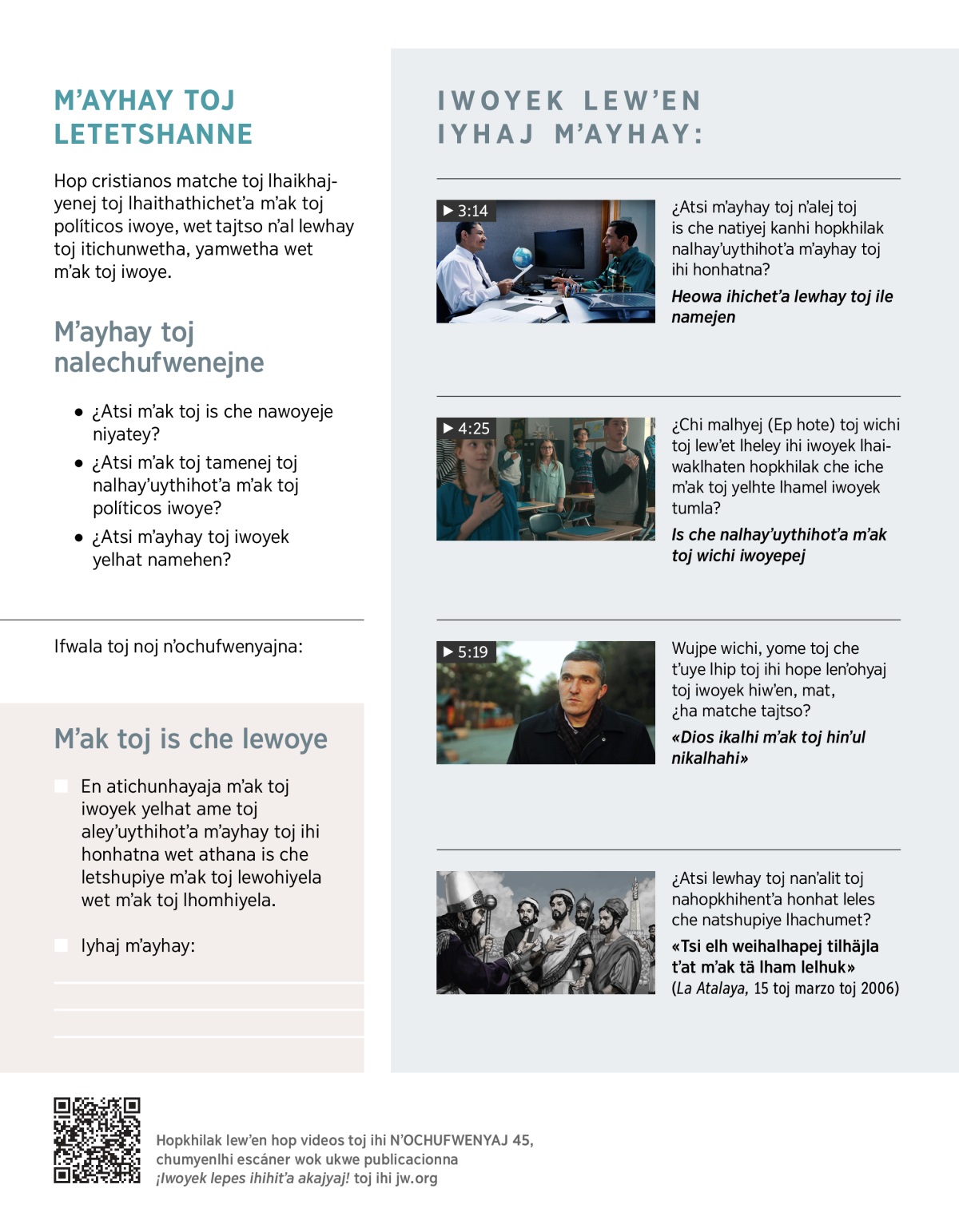 Jesús yome pʼante lechufwenkay toj yok: «nemhit ahäpehen honhat leles» (Juan 15:19). Toja hope toj lhayʼuythihotʼa mʼak toj políticos iwoye wet ihohiyetʼa nʼokaʼtshayaj. Mat atha toj nʼoelh lhayʼuythihotʼa mʼayhay toj ihi honhatna. Iwoyek, wichi ilakwetha namel toj nawoye tajtso. ¿Chi malhyej (Ep hote) toj iwoyek nanʼalit toj nalhayʼuythihotʼa mʼayhay toj ihi honhatna wet natʼifwtiyej Heowa?