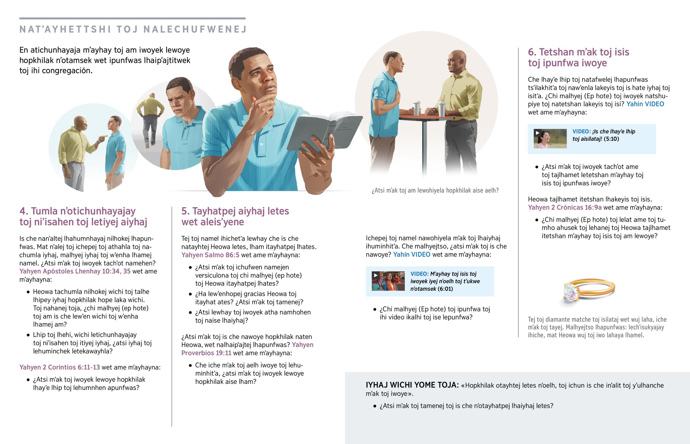 «Mälhetwek akhajyhayaj lhäyʼe ahusek tä alehumnhen» (1 Pedro 1:22). ¿Chi malhyej (Ep hote) toj iwoyek lehanlhi nʼofwonyajna? Isitʼa che tajlhamet letetshan mʼak toj niʼisa toj iyhaj iwoye, tetshan lakeyis toj isen. Yej tsʼilkat toj ayʼe iyhaj toj wʼawulhla mʼak toj am lewʼen, hate alekhajyenej toj letafwelej wichi toj talhe lhip elh wet toj laka cultura wʼenha lhamej. Hate alekhajyenej toj letompha nilhokej mʼayhay toj niʼisahen toj talho ahusek toj letiyej aelh at che hope (yahyen 1 Pedro 2:17).a