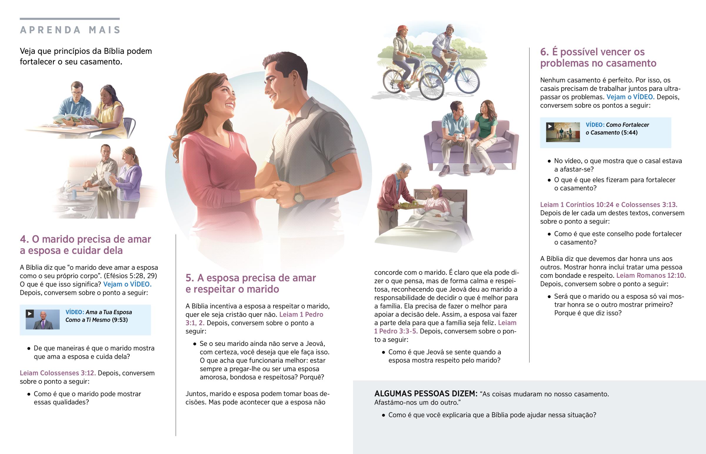 O marido leva chá à sua esposa que está na cama. Marido e esposa lavam e limpam a louça juntos. Marido e esposa estudam a Bíblia juntos. Marido e esposa andam de bicicleta. Marido e esposa conversam sobre um problema.