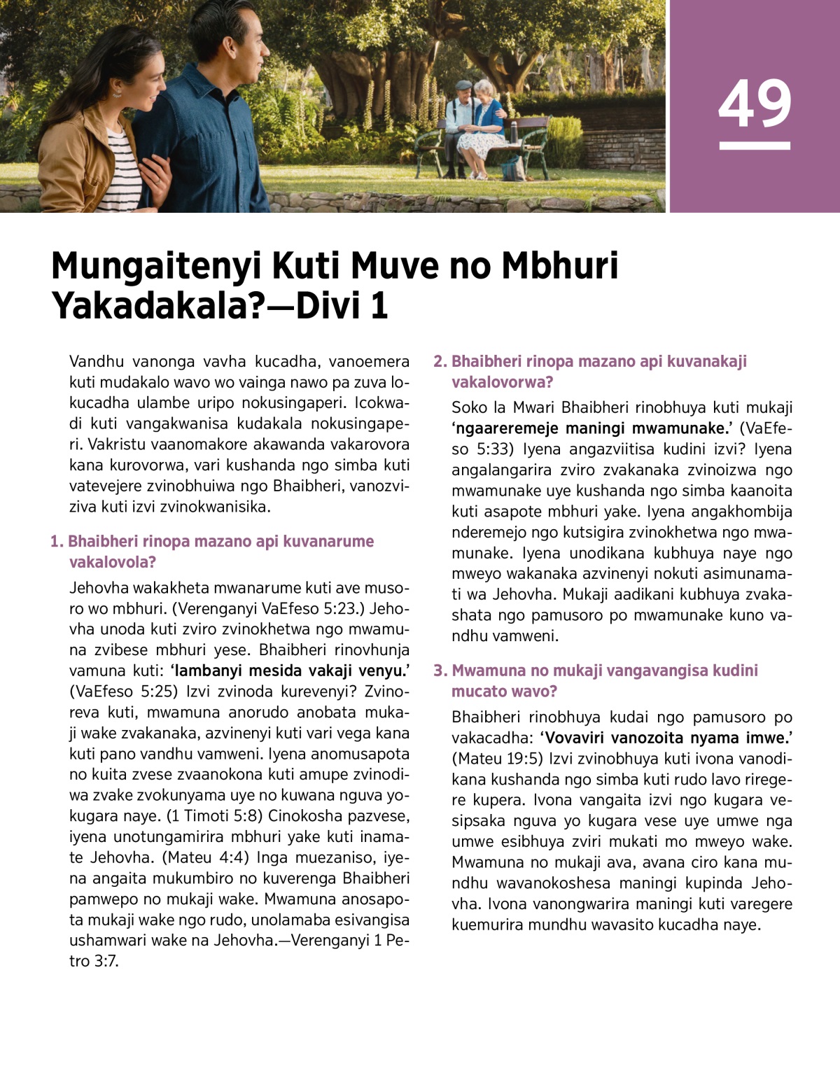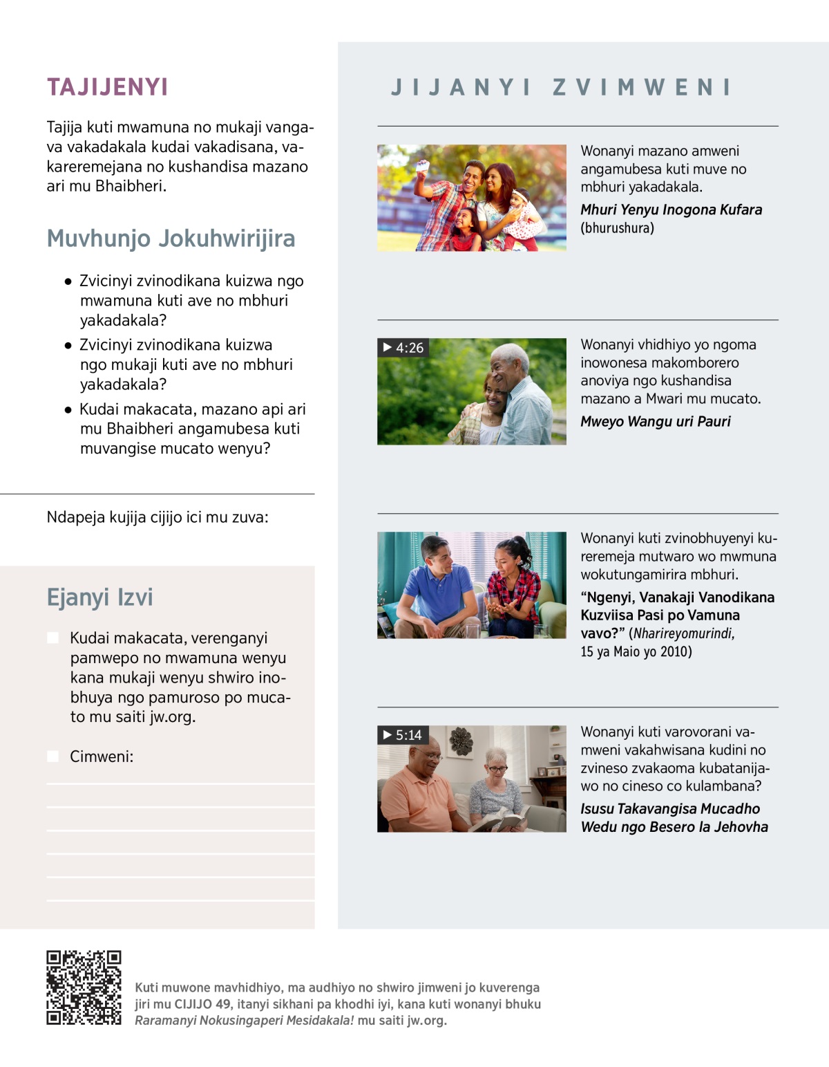 Kudai mwamunenyu asiri munamati wa Jehovha, nguva imweni munoda kuti azoguma pakuva munamati wa Jehovha. Zvicinyi zvamunolangarira kuti zvaizomubesa kuti mwamunenyu atange kunamata Jehovha: Kugala mesimuparijira here kana kuva mukaji wakanaka anonderemejo? Ngenyi madalo?