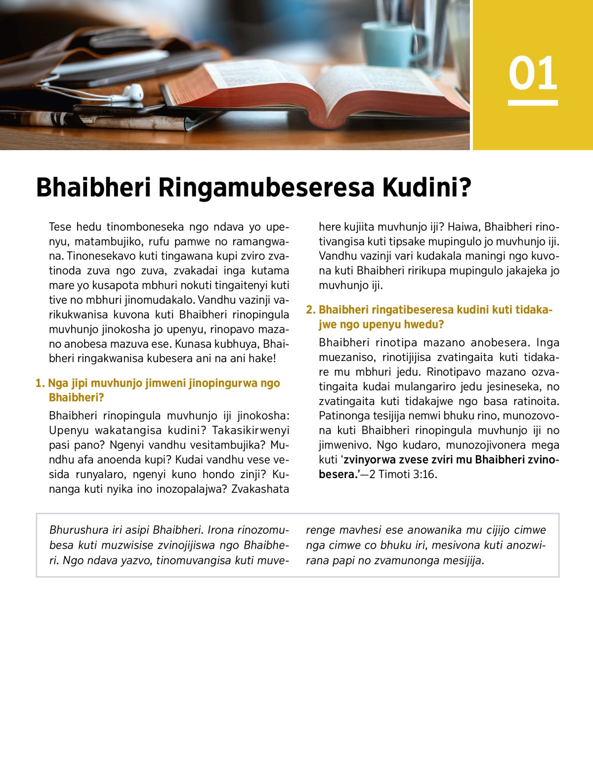 Tese hedu tinomboneseka ngo ndava yo upenyu, matambujiko, rufu pamwe no ramangwana. Tinonesekavo kuti tingawana kupi zviro zvatinoda zuva ngo zuva, zvakadai inga kutama mare yo kusapota mbhuri nokuti tingaitenyi kuti tive no mbhuri jinomudakalo. Vandhu vazinji varikukwanisa kuvona kuti Bhaibheri rinopingula muvhunjo jinokosha jo upenyu, rinopavo mazano anobesa mazuva ese. Kunasa kubhuya, Bhaibheri ringakwanisa kubesera ani na ani hake!