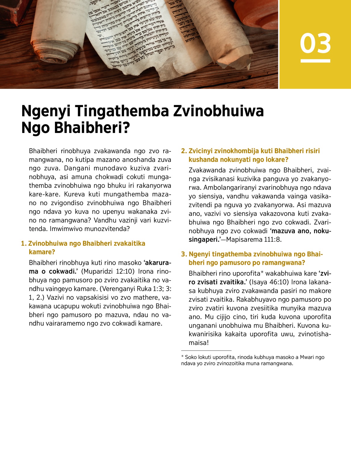 Bhaibheri rinobhuya zvakawanda ngo zvo ramangwana, no kutipa mazano anoshanda zuva ngo zuva. Dangani munodavo kuziva zvarinobhuya, asi amuna chokwadi cokuti mungathemba zvinobhuiwa ngo bhuku iri rakanyorwa kare-kare. Kureva kuti mungathemba mazano no zvigondiso zvinobhuiwa ngo Bhaibheri ngo ndava yo kuva no upenyu wakanaka zvino no ramangwana? Vandhu vazinji vari kuzvitenda. Imwimwivo munozvitenda?