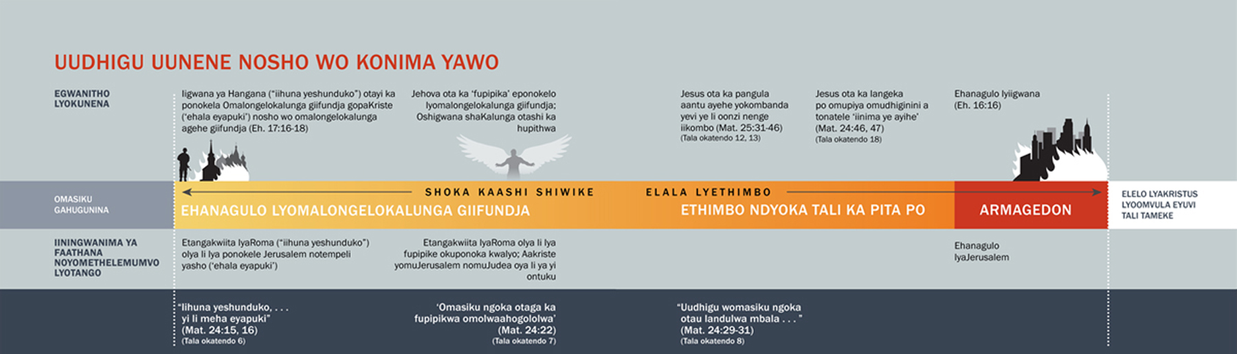 8 Oshike tashi ka ningwa uuna oshitopolwa shotango shuudhigu uunene sha hulu? Oohapu dhaJesus otadhi ulike kutya otapu ka kala elala lyethimbo ndyoka tali ka kala po sigo opokutameka kwaArmagedon. Oshike tashi ka ningwa momukokomoko gwethimbo ndyoka? Eyamukulo oli li muHesekiel 38:14-16 nomuMateus 24:29-31. (Lesha.)b Konima yaashono, Armagedon ote ya, ngoka e li ehulilo lyuudhigu uunene, ndyoka lya faathana nehanagulo lyaJerusalem mo 70 E.N. (Mal. 4:1) Niita yaArmagedon mbyoka yi li ehulilo lyawo, uudhigu uunene mboka wu li pokuya otawu ka kala wi ikalekelwa, oshiningwanima ‘shoka inaashi kala ko nale okuza ketameko lyuuyuni.’ (Mat. 24:21) Uuna a hulu, Elelo lyaKristus lyOomvula Eyuvi otali ka tameka.