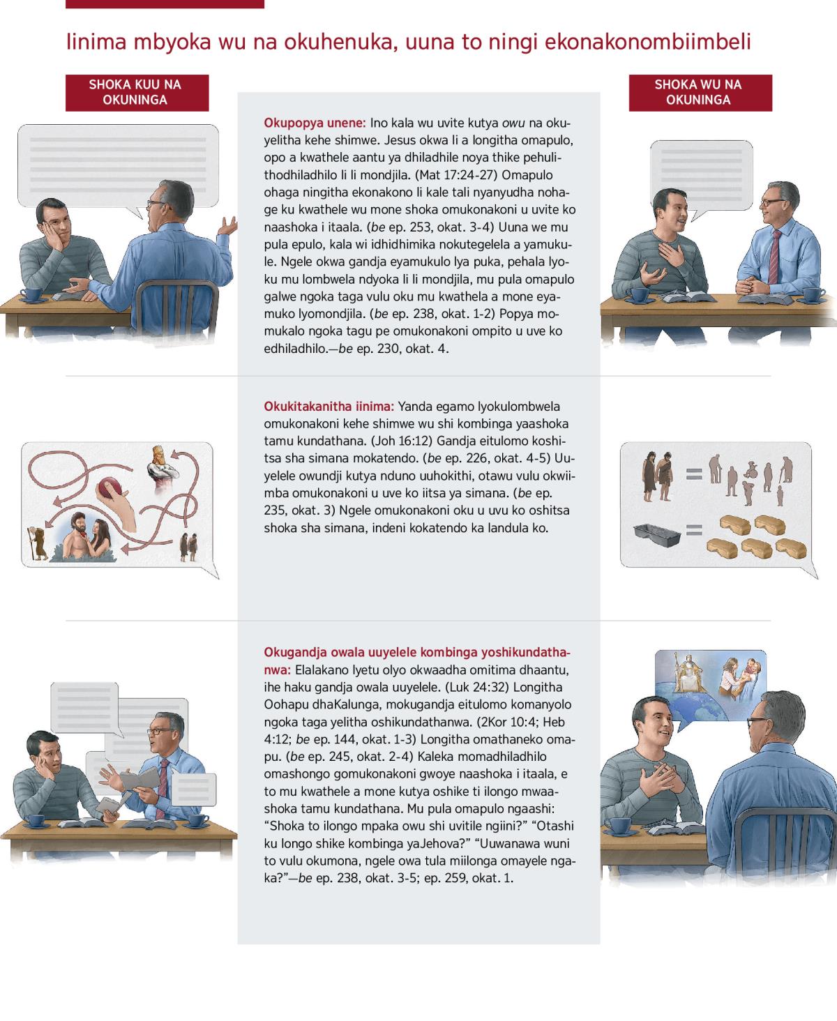 Okupopya unene: Ino kala wu uvite kutya owu na okuyelitha kehe shimwe. Jesus okwa li a longitha omapulo, opo a kwathele aantu ya dhiladhile noya thike pehulithodhiladhilo li li mondjila. (Mat 17:24-27) Omapulo ohaga ningitha ekonakono li kale tali nyanyudha nohage ku kwathele wu mone shoka omukonakoni u uvite ko naashoka i itaala. (be ep. 253, okat. 3-4) Uuna we mu pula epulo, kala wi idhidhimika nokutegelela a yamukule. Ngele okwa gandja eyamukulo lya puka, pehala lyoku mu lombwela ndyoka li li mondjila, mu pula omapulo galwe ngoka taga vulu oku mu kwathela a mone eyamuko lyomondjila. (be ep. 238, okat. 1-2) Popya momukalo ngoka tagu pe omukonakoni ompito u uve ko edhiladhilo.—be ep. 230, okat. 4.