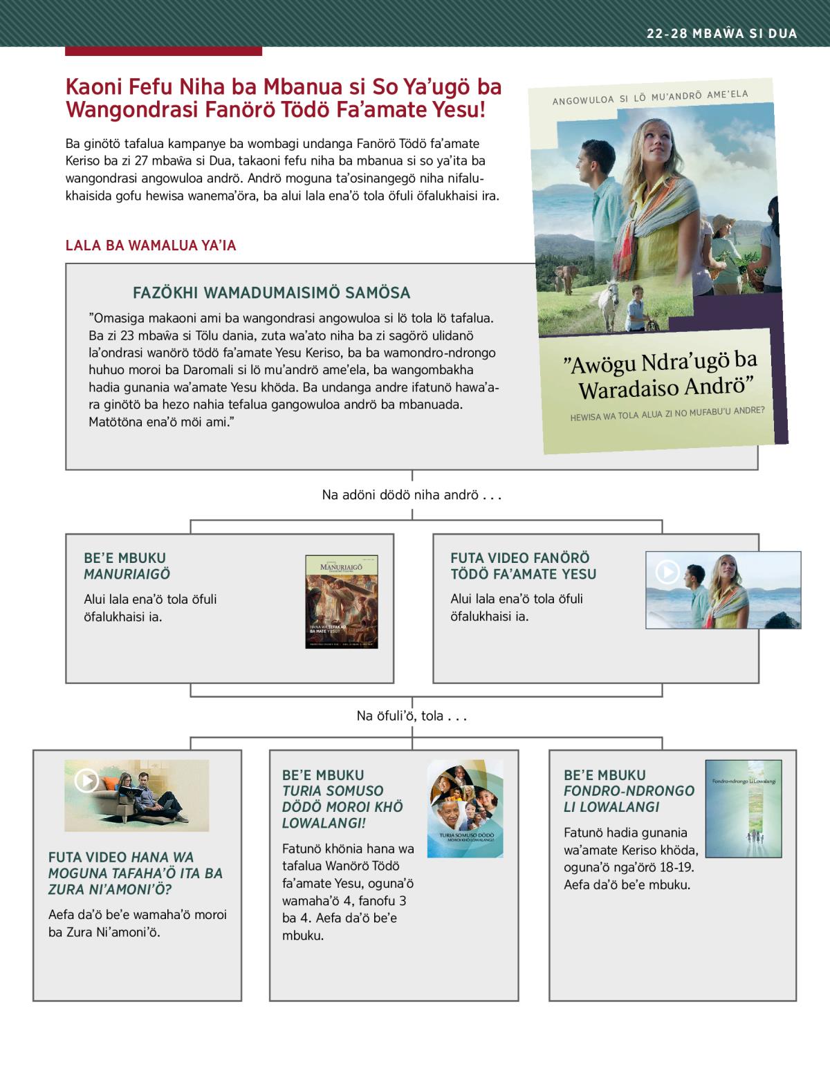 ”Omasiga makaoni ami ba wangondrasi angowuloa si lö tola lö tafalua. Ba zi 23 mbaŵa si Tölu dania, zuta waʼato niha ba zi sagörö ulidanö laʼondrasi wanörö tödö faʼamate Yesu Keriso, ba ba wamondro-ndrongo huhuo moroi ba Daromali si lö muʼandrö ameʼela, ba wangombakha hadia gunania waʼamate Yesu khöda. Ba undanga andre ifatunö hawaʼara ginötö ba hezo nahia tefalua gangowuloa andrö ba mbanuada. Matötöna enaʼö möi ami.”