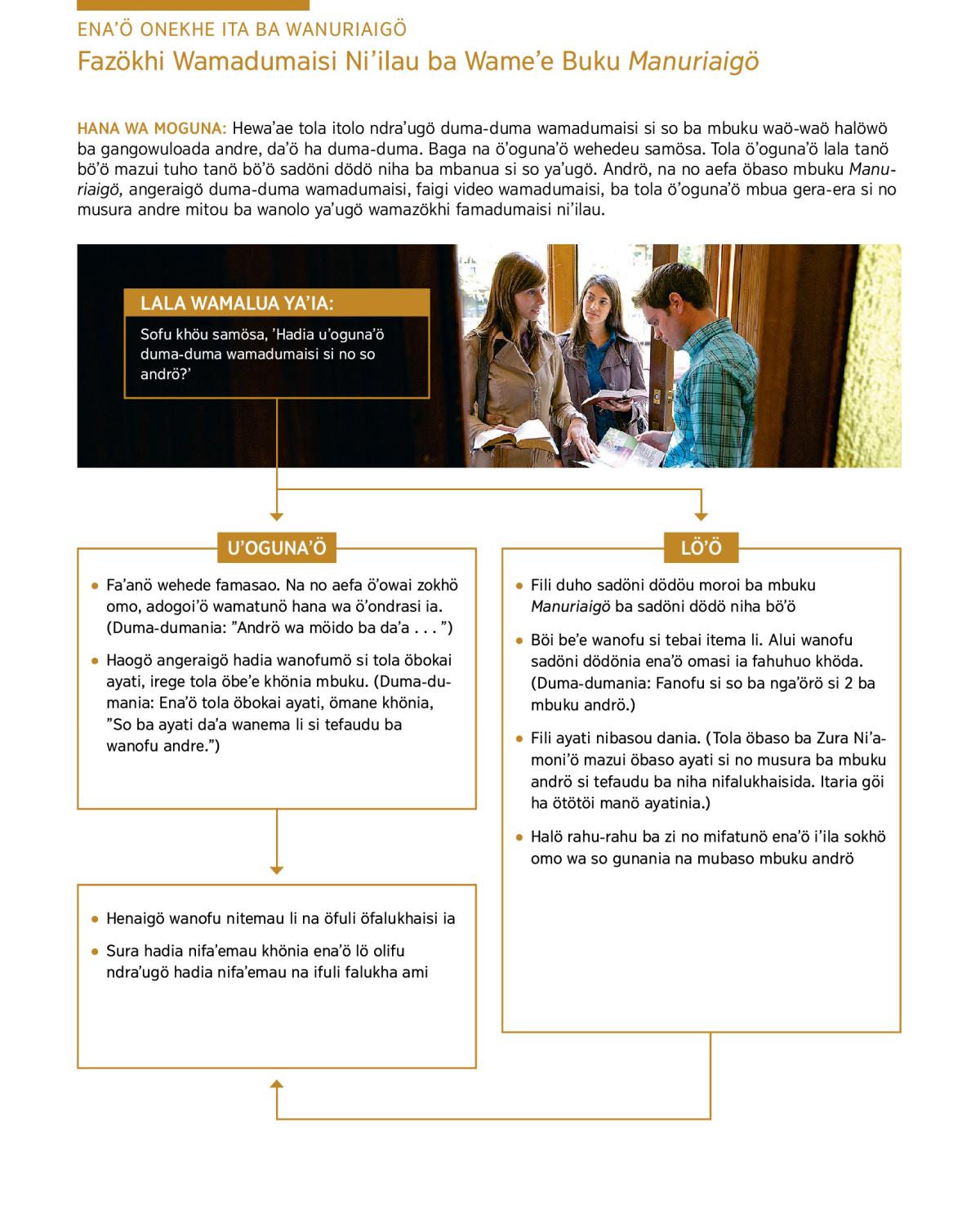 HANA WA MOGUNA: Hewaʼae tola itolo ndraʼugö duma-duma wamadumaisi si so ba mbuku waö-waö halöwö ba gangowuloada andre, daʼö ha duma-duma. Baga na öʼogunaʼö wehedeu samösa. Tola öʼogunaʼö lala tanö böʼö mazui tuho tanö böʼö sadöni dödö niha ba mbanua si so yaʼugö. Andrö, na no aefa öbaso mbuku Manuriaigö, angeraigö duma-duma wamadumaisi, faigi video wamadumaisi, ba tola öʼogunaʼö mbua gera-era si no musura andre mitou ba wanolo yaʼugö wamazökhi famadumaisi niʼilau.