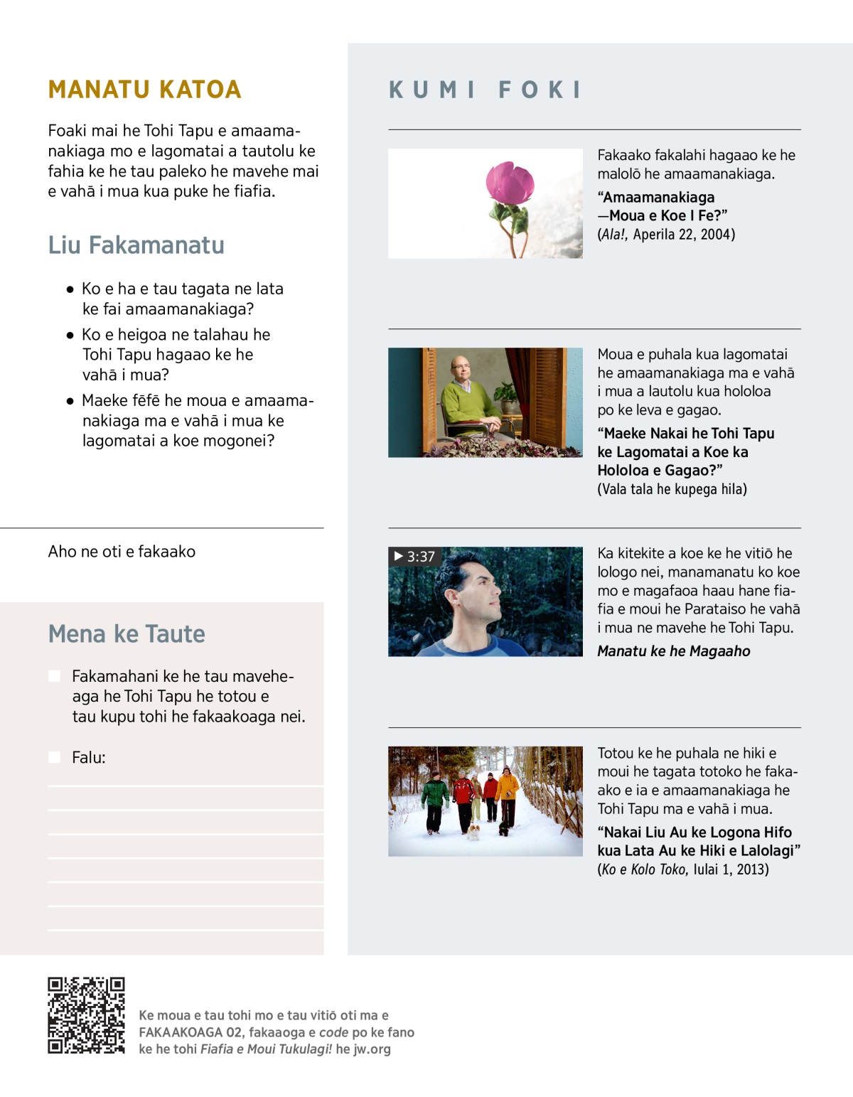 Ko e tau tagata he lalolagi katoa ne fehagai mo e tau lekua kua tupu mai e tau logonaaga momoko, fakaatukehe, mo e matematekelea ki a lautolu. Kua fehagai nakai a koe mo e tuaga ne taute a koe ke logona hifo pihia? Liga matematekelea a koe ha ko e gagao po ke mate e fakahele haau. Liga hūhū hifo a koe, ‘To holo ki mua nakai e moui?’ Foaki he Tohi Tapu e tali mafanatia ke he hūhū ia.