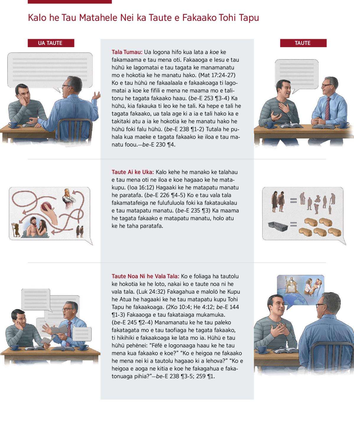 Taute Noa Ni he Vala Tala: Ko e foliaga ha tautolu ke hokotia ke he loto, nakai ko e taute noa ni he vala tala. (Luk 24:32) Fakagahua e malolō he Kupu he Atua he hagaaki ke he tau matapatu kupu Tohi Tapu he fakaakoaga. (2Ko 10:4; He 4:12; be-E 144 ¶1-3) Fakaaoga e tau fakataiaga mukamuka. (be-E 245 ¶2-4) Manamanatu ke he tau paleko fakatagata mo e tau taofiaga he tagata fakaako, ti hikihiki e fakaakoaga ke lata mo ia. Hūhū e tau hūhū pehēnei: “Fēfē e logonaaga haau ke he tau mena kua fakaako e koe?” “Ko e heigoa ne fakaako he mena nei ki a tautolu hagaao ki a Iehova?” “Ko e heigoa e aoga ne kitia e koe he fakagahua e fakatonuaga pihia?”​—be-E 238 ¶3-5; 259 ¶1.