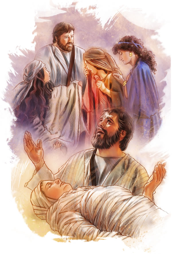 Wat voor ergs gebeurt er nu met Dorkas? — Ze wordt heel ziek en gaat dood. Al haar vrienden zijn verdrietig. Daarom sturen ze mensen naar de stad waar Petrus is, ongeveer vijftien kilometer verderop. Ze vragen hem of hij meteen mee kan komen. Als hij bij het huis aankomt, gaat hij naar boven, waar Dorkas ligt. De vrouwen huilen allemaal en laten hem de kleren zien die Dorkas voor ze heeft gemaakt.