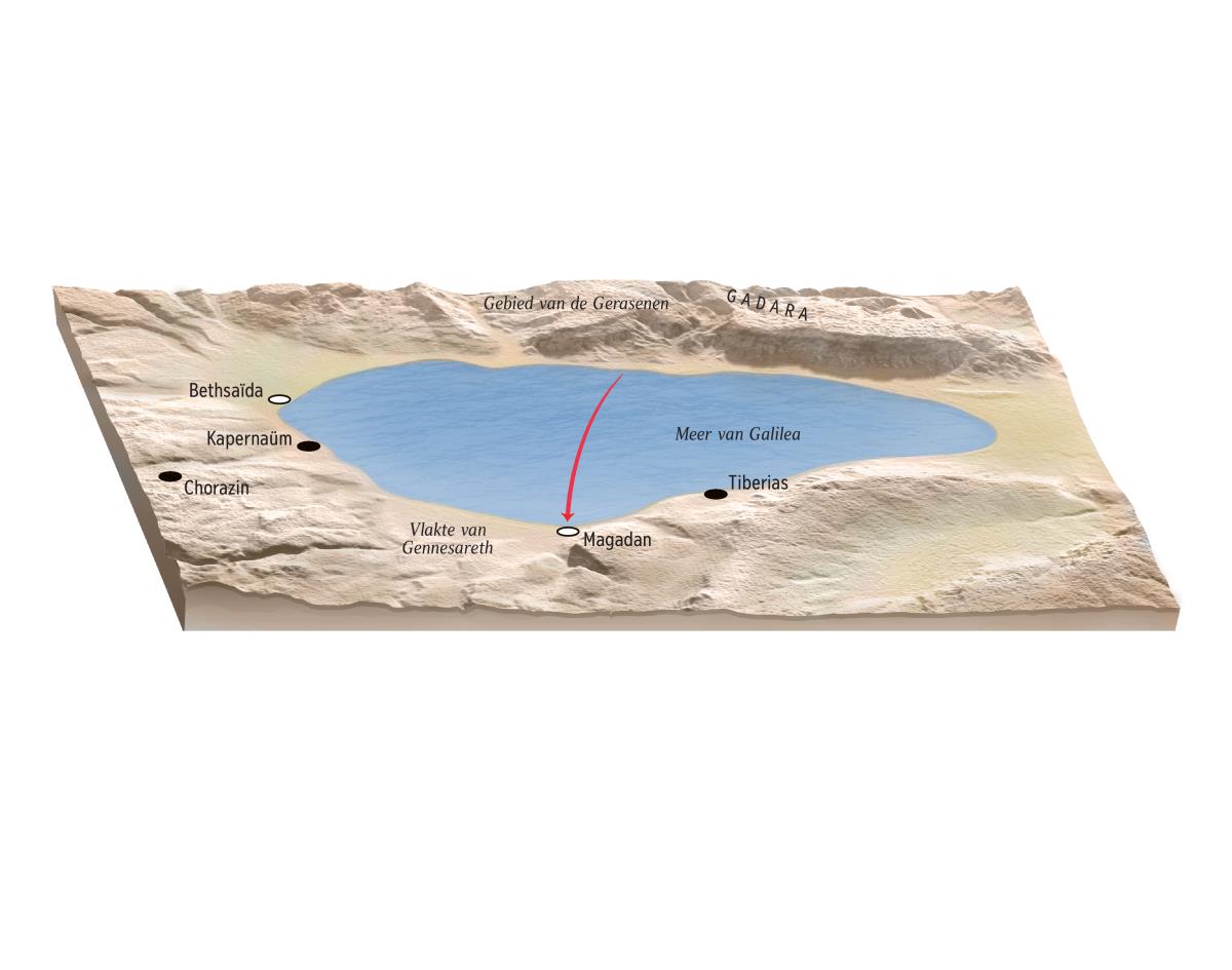 Nadat Jezus 4000 mannen en ook vrouwen en kinderen had gevoed, maakten hij en zijn discipelen per boot de oversteek naar het gebied van Magadan, aan de westelijke oever van het Meer van Galilea. In het parallelverslag van Markus wordt het gebied Dalmanoetha genoemd (Mr 8:10; zie Appendix A7-D voor gedetailleerdere kaarten van Jezus’ bediening).