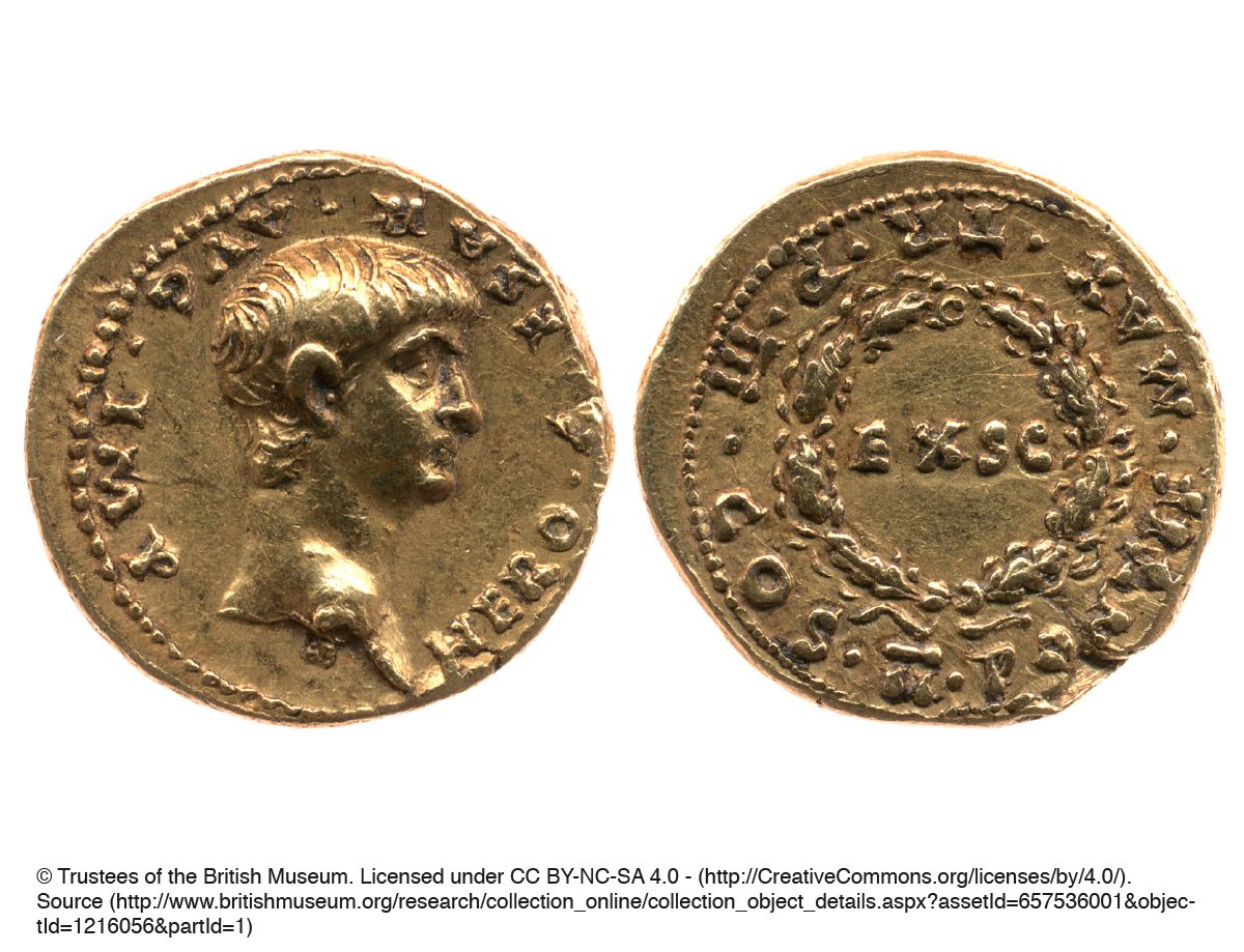 Deze gouden munt is geslagen rond 56/57 n.Chr. Op de ene kant is een portret van Nero te zien, die van 54 tot 68 keizer van het Romeinse Rijk was. Nero was de keizer op wie Paulus zich beriep na zijn onterechte arrestatie in Jeruzalem en zijn daaropvolgende gevangenschap in Cesarea van ongeveer 56 tot ongeveer 58. Rond het jaar 59 werd Paulus in Rome gevangengezet, maar blijkbaar werd hij rond 61 vrijgesproken en vrijgelaten. Maar in 64 werd een kwart van Rome door een brand verwoest, en sommigen gaven Nero daar de schuld van. Om zich van verdenking vrij te pleiten, beschuldigde Nero de christenen van brandstichting, wat leidde tot gewelddadige vervolging door de overheid. Waarschijnlijk is Paulus rond die tijd (65 n.Chr.) een tweede keer in Rome gevangengezet en daarna terechtgesteld.