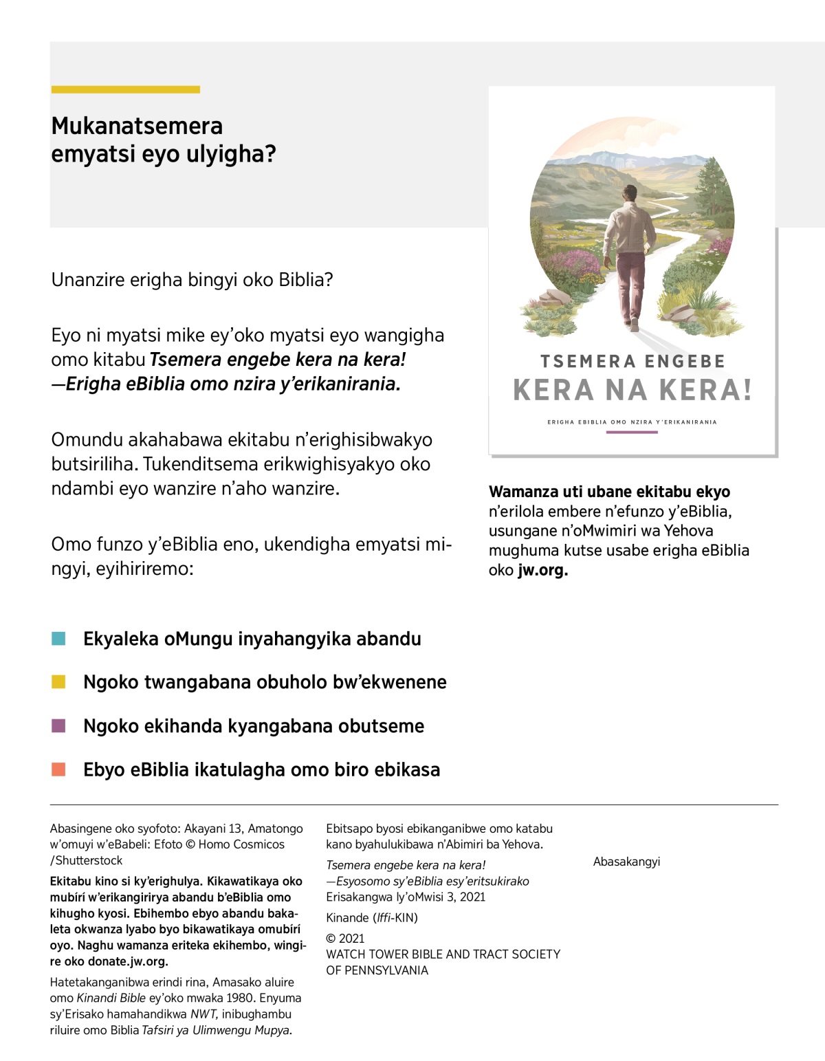 Wamanza uti ubane ekitabu ekyo n’erilola embere n’efunzo y’eBiblia, usungane n’oMwimiri wa Yehova mughuma kutse usabe erigha eBiblia oko jw.org.