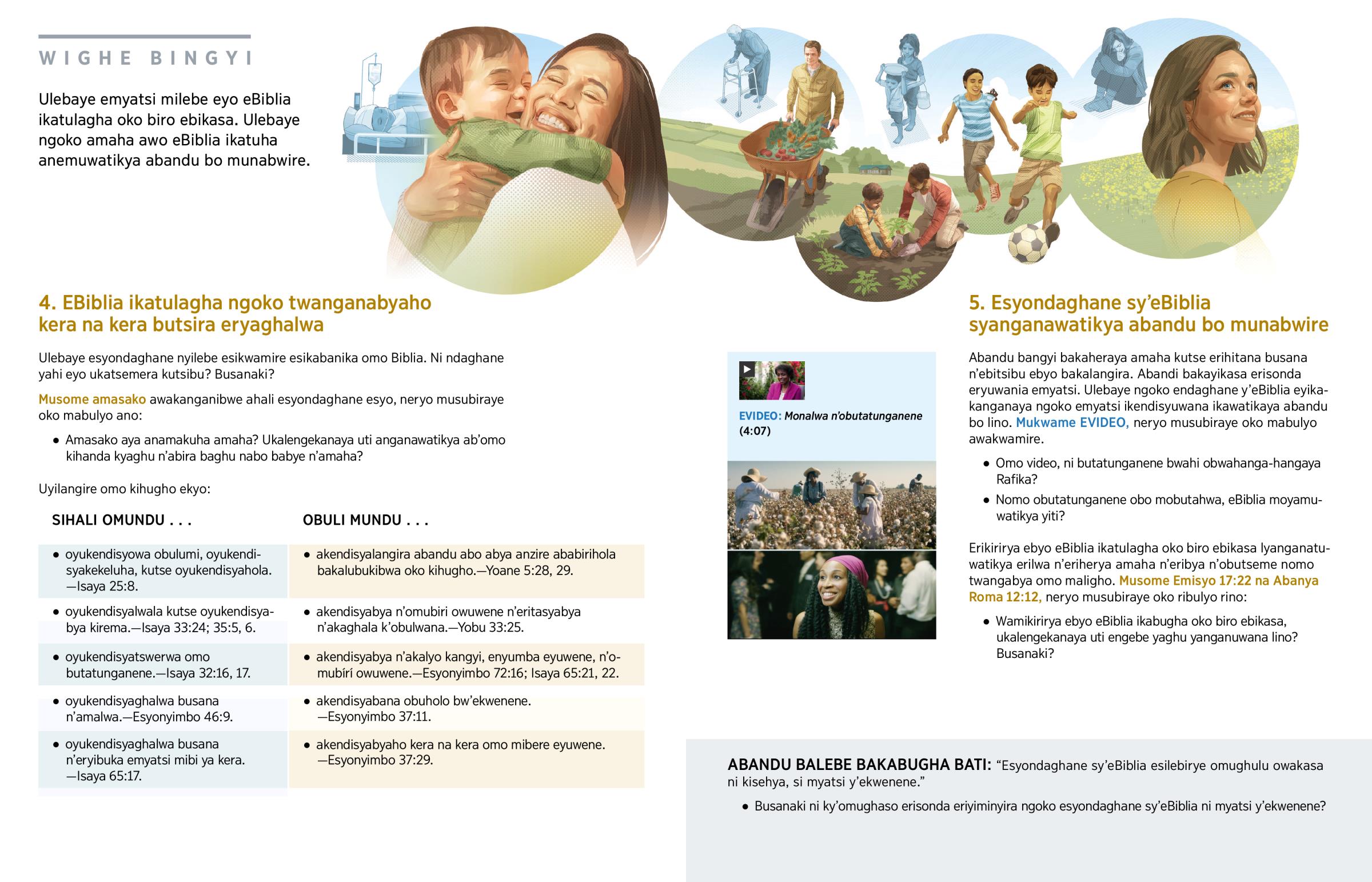 EBiblia ikakanganaya ngoko omo biro ebikasa, ‘oluholo silwendisyasyabyaho kutse eririra, kutse erisusumana, kutse eryaghalwa sibyendisyasyabyaho.’ (Soma Eribisulirwa 21:4.) Emyatsi eyikaleka abandu ibabula amaha munabwire, ng’obwera, erikolerwa omo butatunganene, amakoni, n’oluholo, sibyendisyasyabyaho. EBiblia ikalagha yiti abandu bakasyatsemera engebe yo kera na kera omo Paradiso oko kihugho.