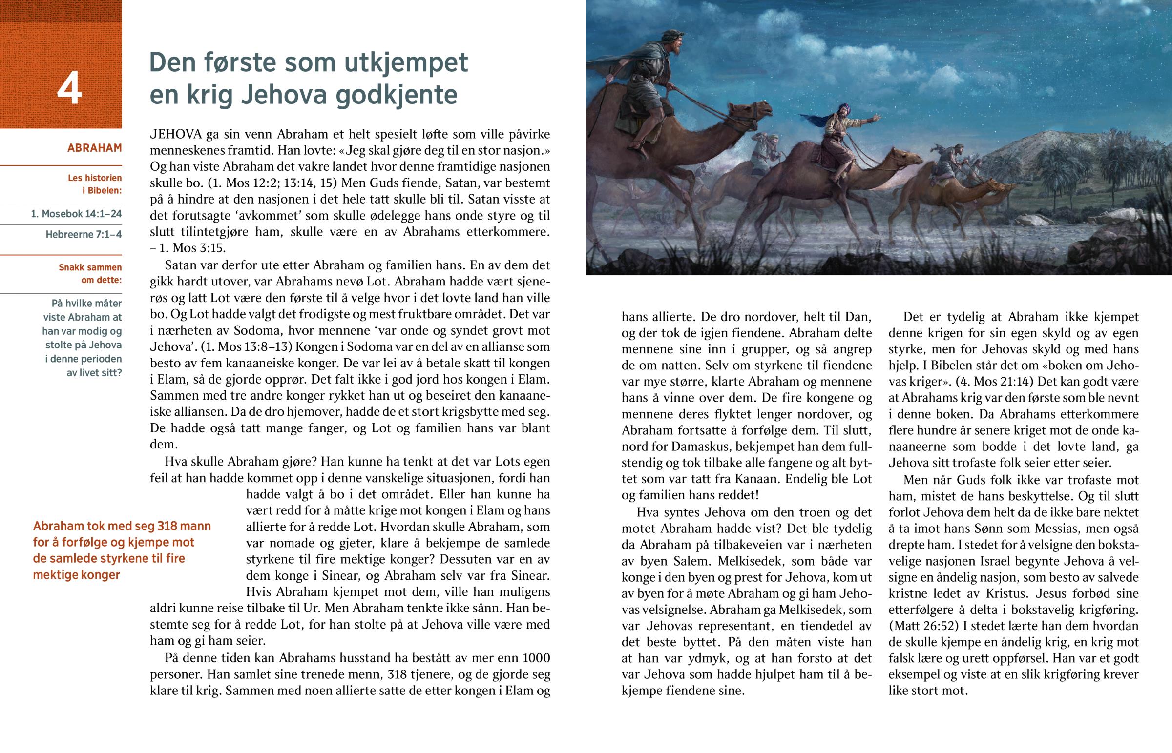 Det er tydelig at Abraham ikke kjempet denne krigen for sin egen skyld og av egen styrke, men for Jehovas skyld og med hans hjelp. I Bibelen står det om «boken om Jehovas kriger». (4. Mos 21:14) Det kan godt være at Abrahams krig var den første som ble nevnt i denne boken. Da Abrahams etterkommere flere hundre år senere kriget mot de onde kanaaneerne som bodde i det lovte land, ga Jehova sitt trofaste folk seier etter seier.