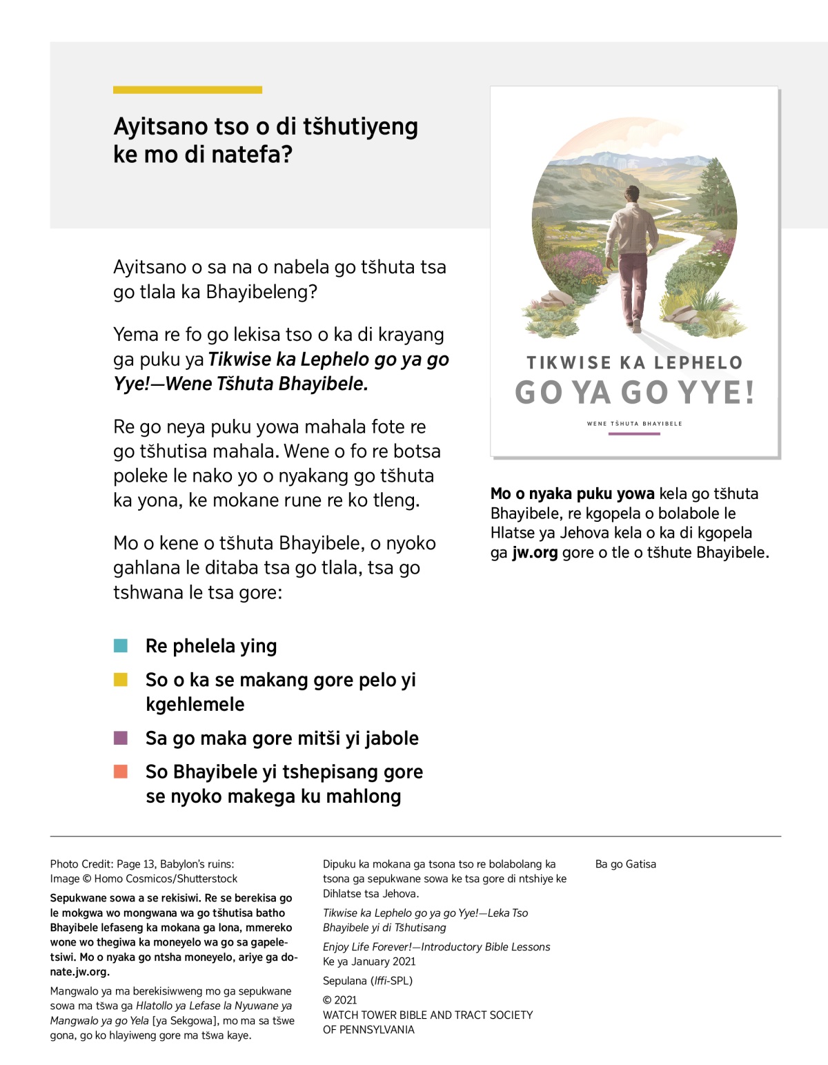 Mo o nyaka puku yowa kela go tšhuta Bhayibele, re kgopela o bolabole le Hlatse ya Jehova kela o ka di kgopela ga jw.org gore o tle o tšhute Bhayibele.
