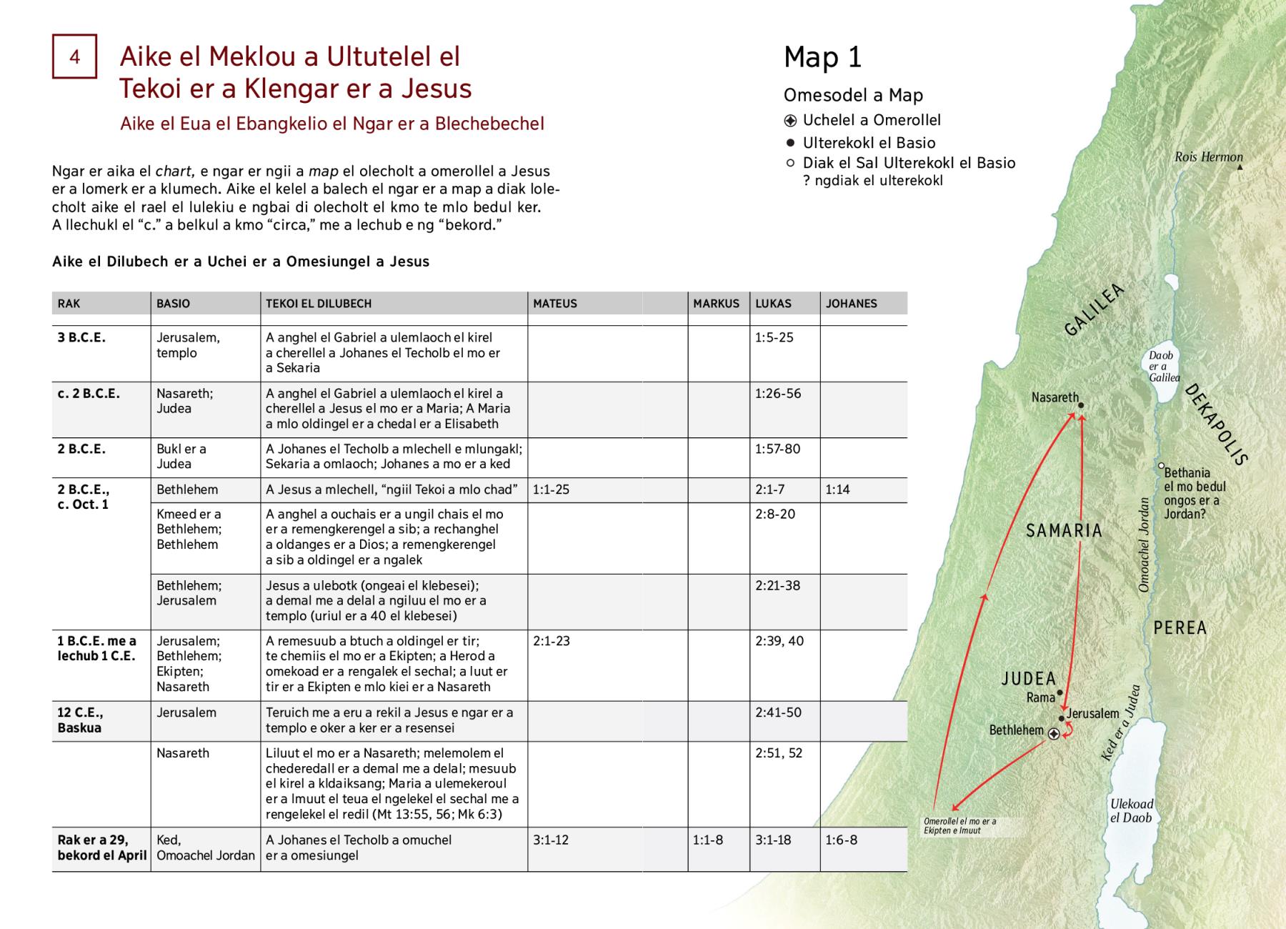 Ngar er aika el chart, e ngar er ngii a map el olecholt a omerollel a Jesus er a lomerk er a klumech. Aike el kelel a balech el ngar er a map a diak lolecholt aike el rael el lulekiu e ngbai di olecholt el kmo te mlo bedul ker. A llechukl el “c.” a belkul a kmo “circa,” me a lechub e ng “bekord.”