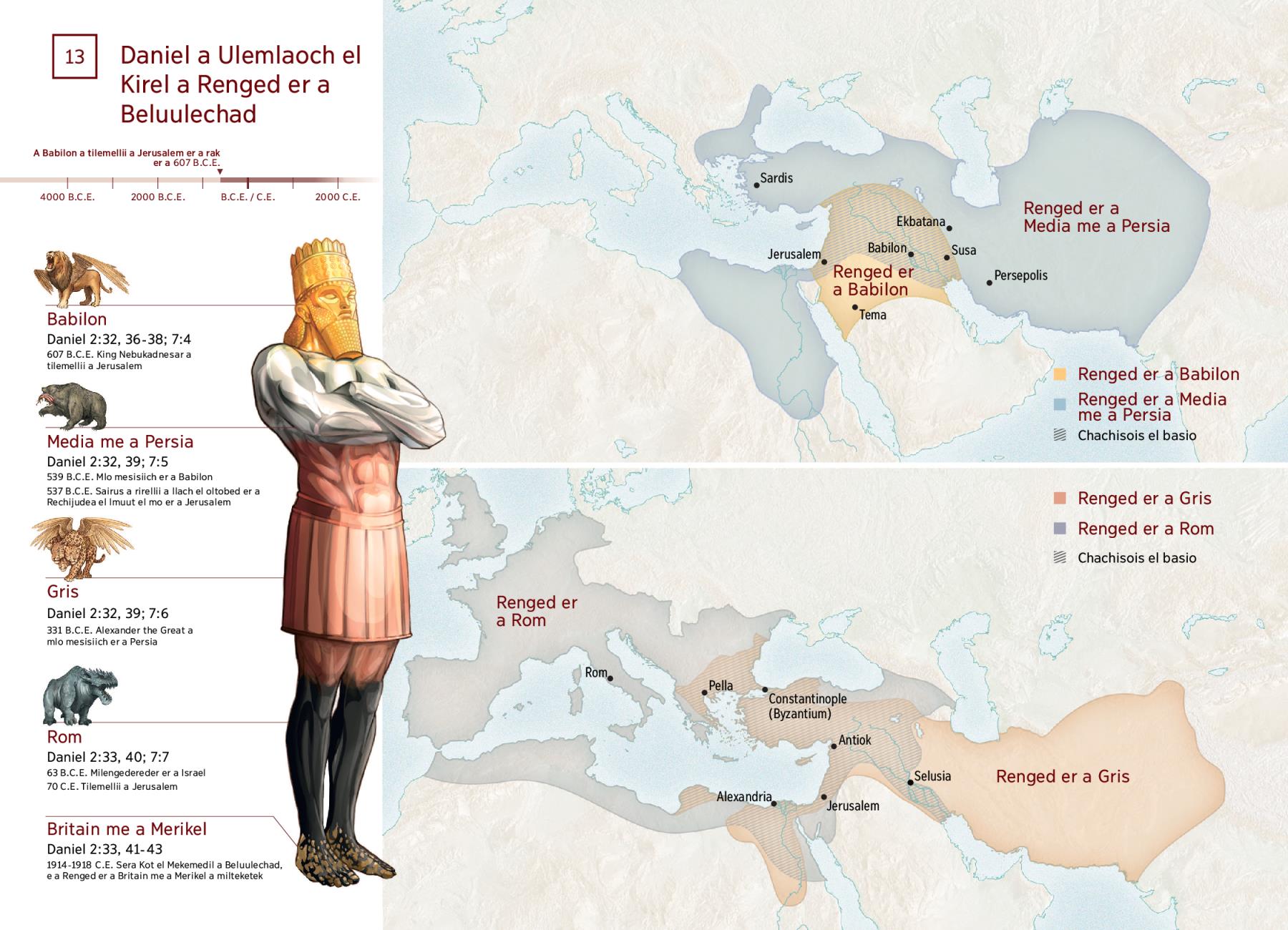 Media me a Persia Daniel 2:32, 39; 7:5 539 B.C.E. Mlo mesisiich er a Babilon 537 B.C.E. Sairus a rirellii a llach el oltobed er a Rechijudea el lmuut el mo er a Jerusalem |