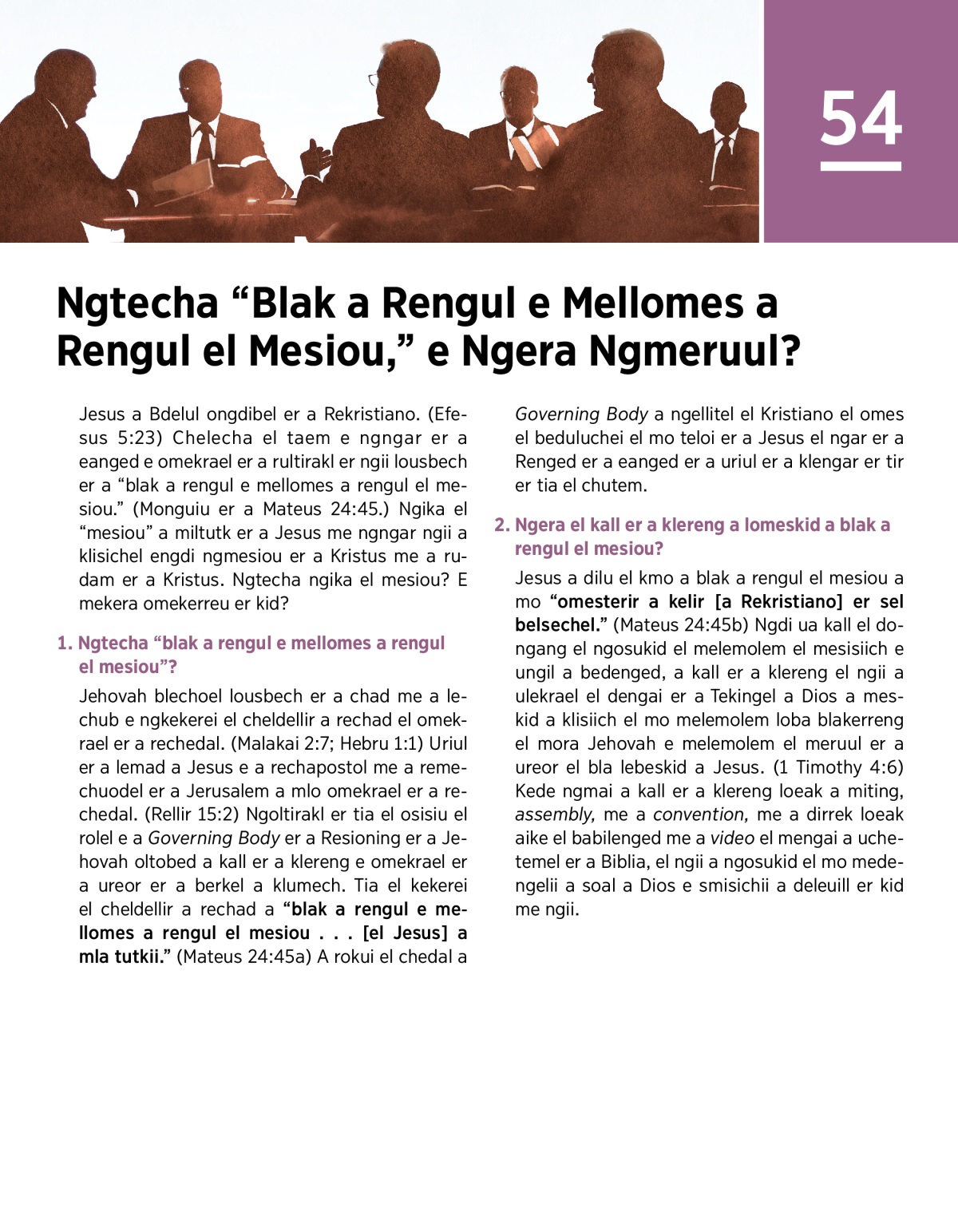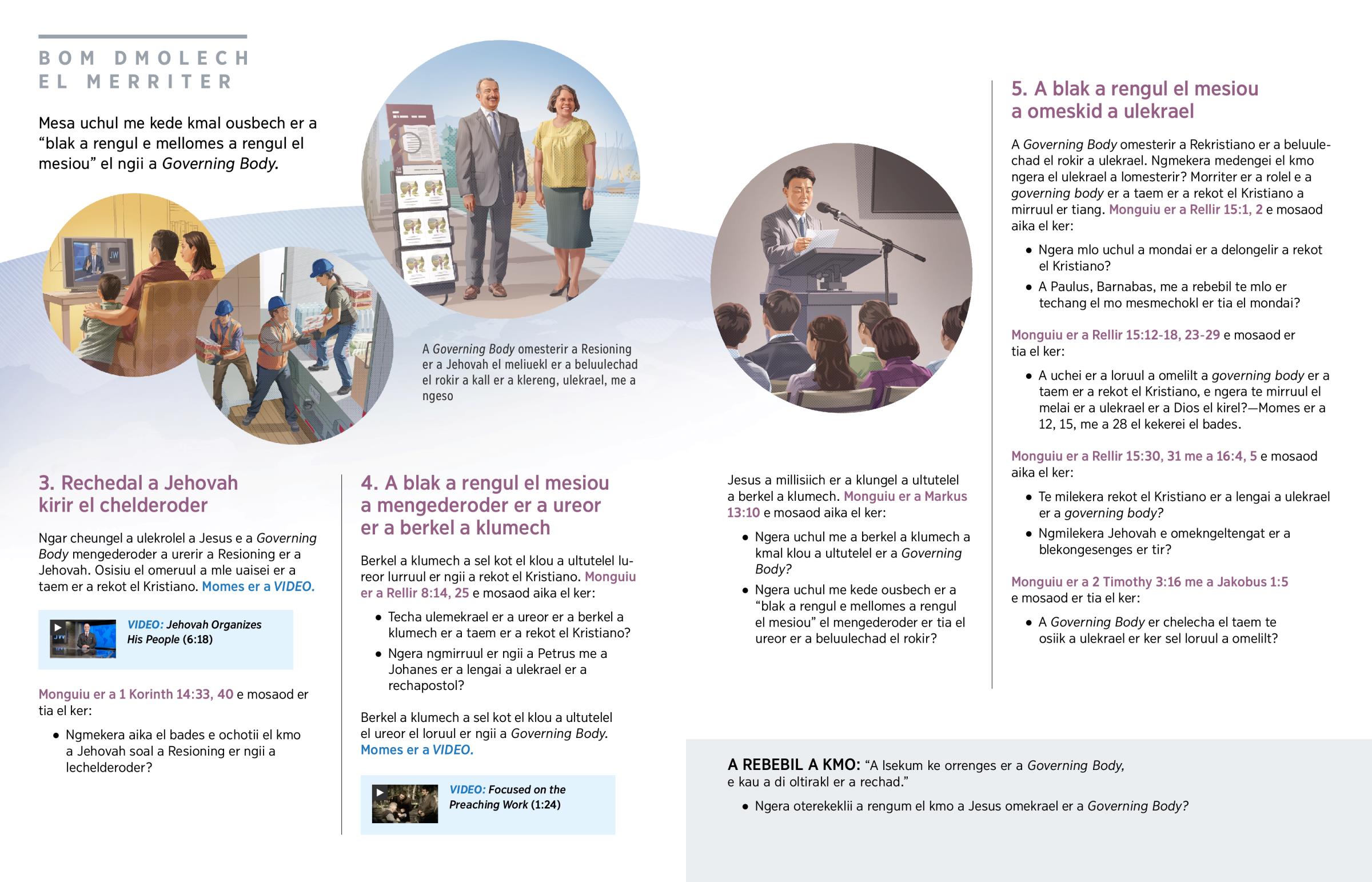 Jehovah blechoel lousbech er a chad me a lechub e ngkekerei el cheldellir a rechad el omekrael er a rechedal. (Malakai 2:7; Hebru 1:1) Uriul er a lemad a Jesus e a rechapostol me a remechuodel er a Jerusalem a mlo omekrael er a rechedal. (Rellir 15:2) Ngoltirakl er tia el osisiu el rolel e a Governing Body er a Resioning er a Jehovah oltobed a kall er a klereng e omekrael er a ureor er a berkel a klumech. Tia el kekerei el cheldellir a rechad a “blak a rengul e mellomes a rengul el mesiou . . . [el Jesus] a mla tutkii.” (Mateus 24:45a) A rokui el chedal a Governing Body a ngellitel el Kristiano el omes el beduluchei el mo teloi er a Jesus el ngar er a Renged er a eanged er a uriul er a klengar er tir er tia el chutem.