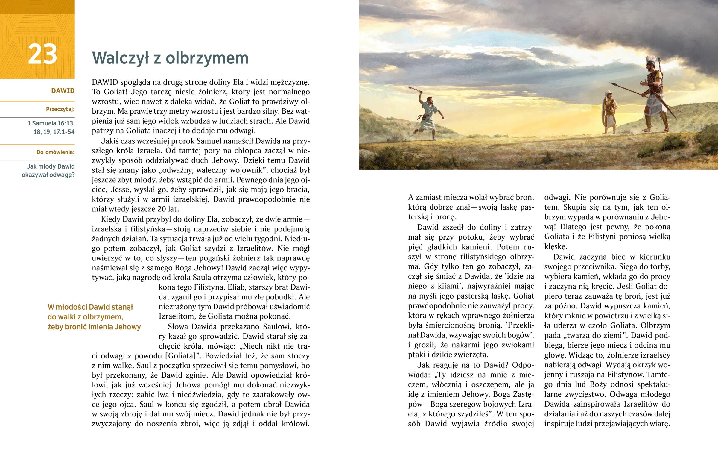DAWID spogląda na drugą stronę doliny Ela i widzi mężczyznę. To Goliat! Jego tarczę niesie żołnierz, który jest normalnego wzrostu, więc nawet z daleka widać, że Goliat to prawdziwy olbrzym. Ma prawie trzy metry wzrostu i jest bardzo silny. Bez wątpienia już sam jego widok wzbudza w ludziach strach. Ale Dawid patrzy na Goliata inaczej i to dodaje mu odwagi.