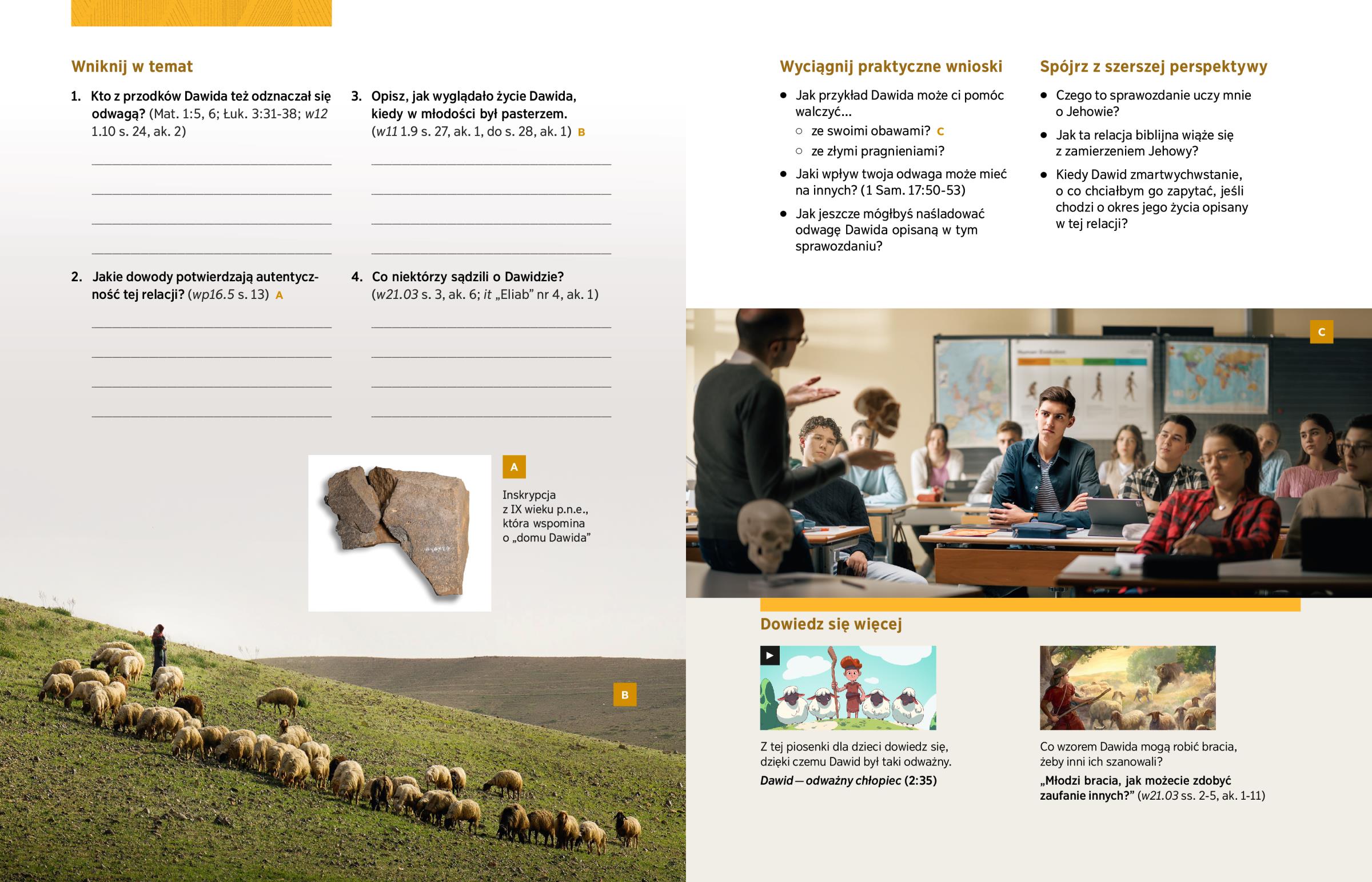 3. Opisz, jak wyglądało życie Dawida, kiedy w młodości był pasterzem. (w11 1.9 s. 27, ak. 1, do s. 28, ak. 1) B